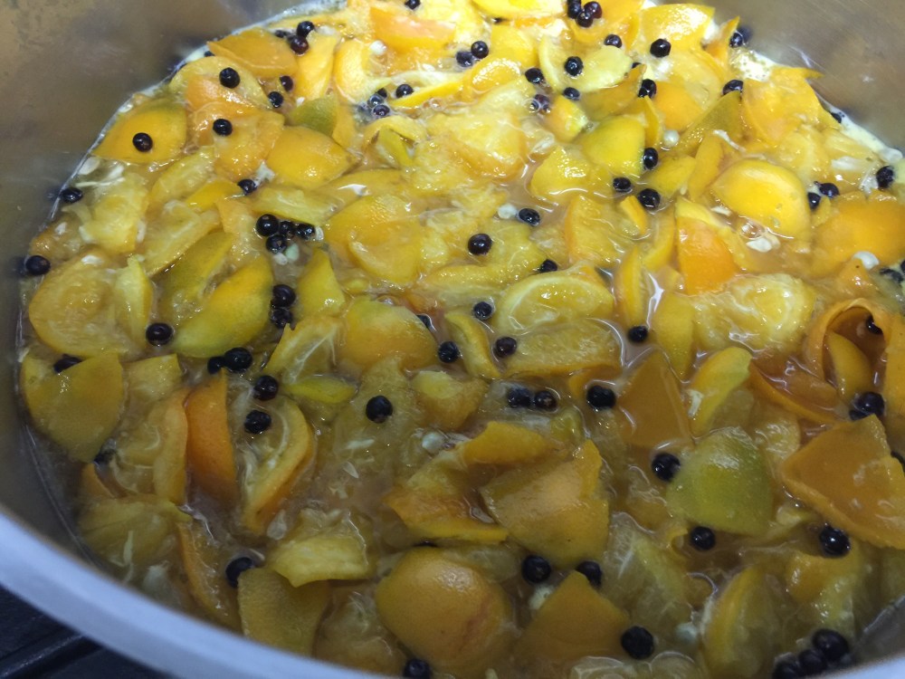 Colocas en una olla todos los ingredientes (calamondines, bayas, limón, ralladuras y azucar, el agua debe llegar al nivel de los frutos) y pones al fuego medio por aproximadamente 45 minutos a 1 hora hasta que cristalice o evapore el agua y quede una tersa miel.