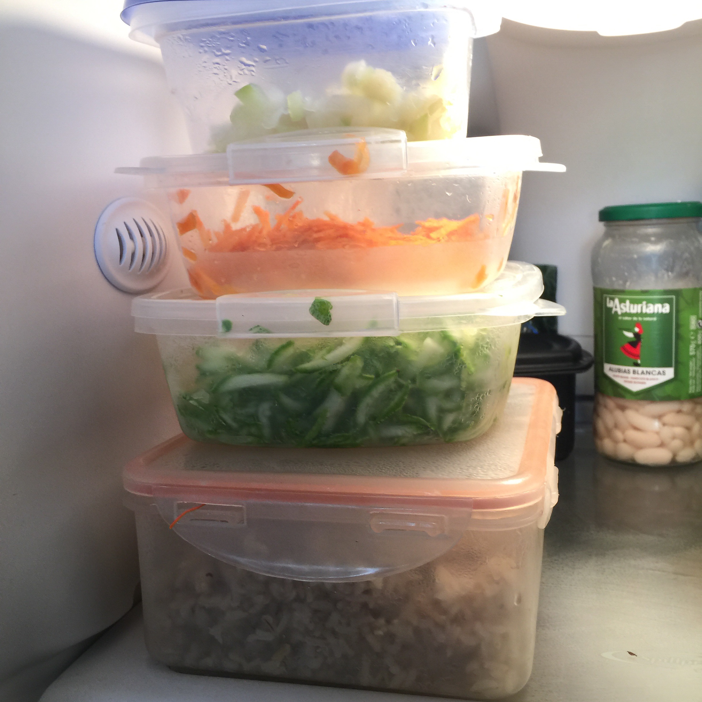 1. Yo mantengo en el refri de todos esos ingredientes en toper para cuando necesito utilizarlos. Mi regla es que si yo no me lo comería mi perro tampoco. Por lo que utilizó esos mismos vegetales y arroz para hacerme ensaladas o lo que necesito.