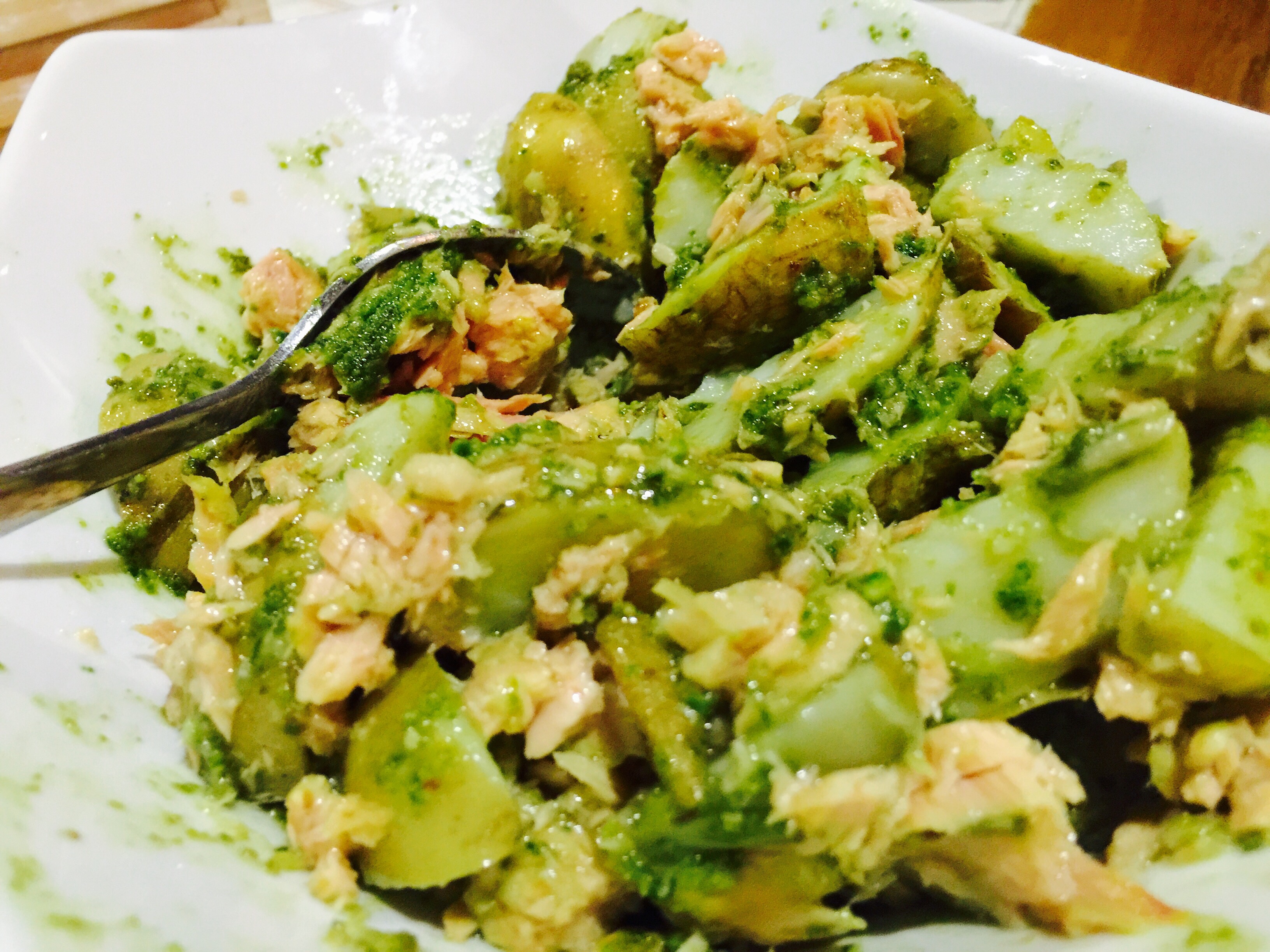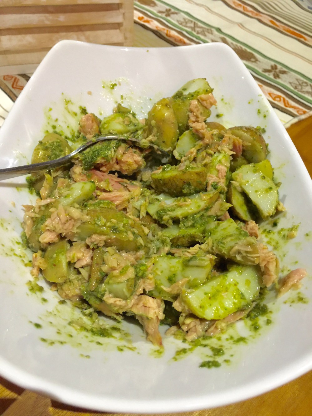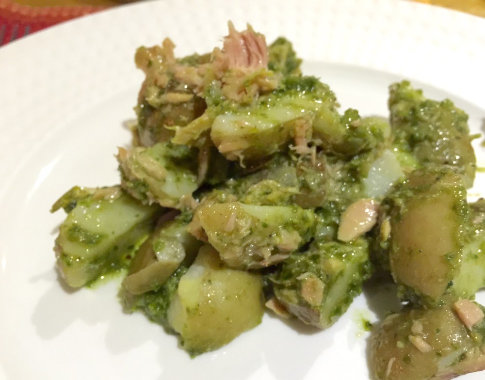 Coloqué dos cucharadas de mi pesto y como estába muy concentrado lo diluí directamente sobre las papas con un chorro abundante de aceite extra virgen y mezclé todo con una cuchara para que penetrara en todas las papas.
