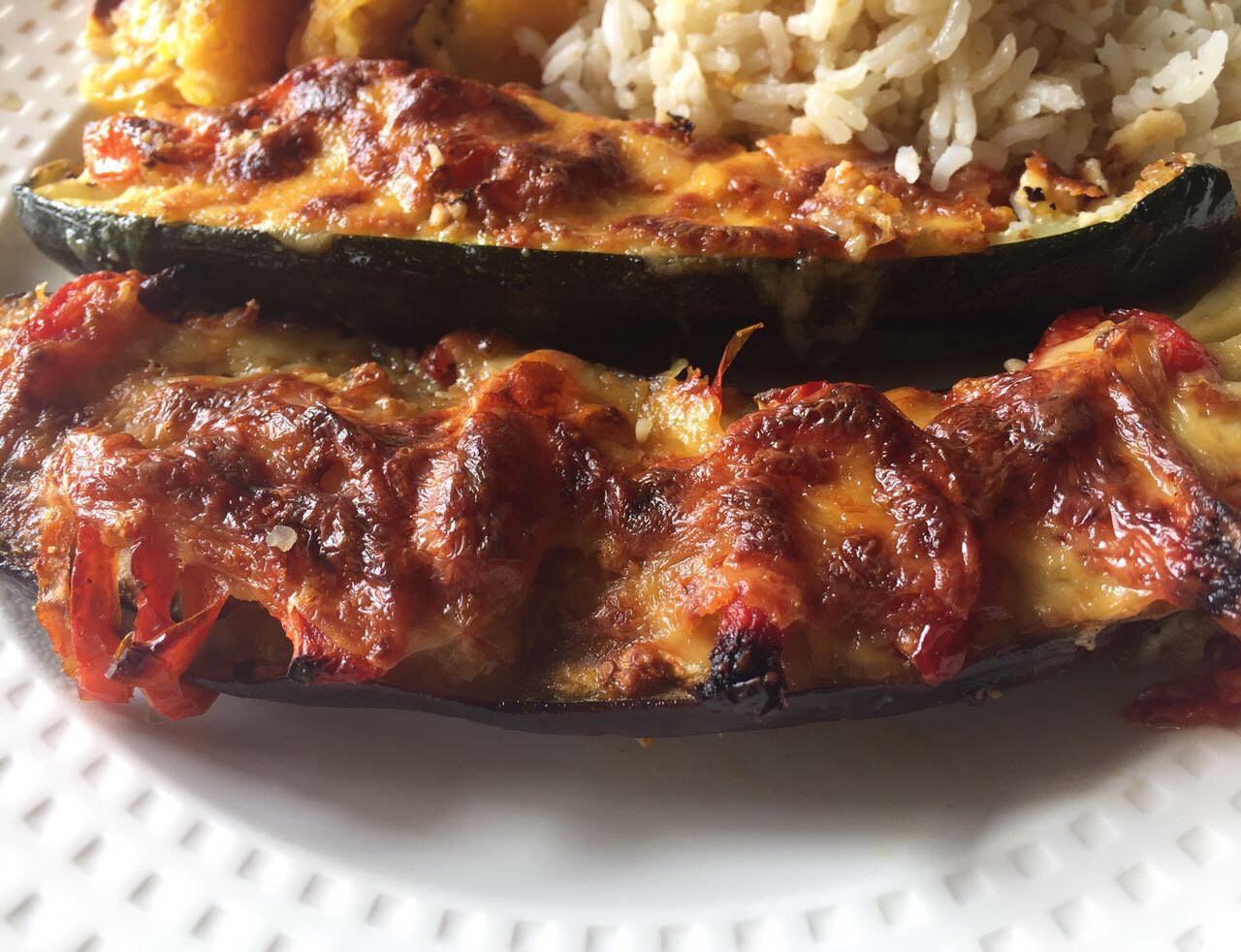 Engrasamos un pirex de horno mediano y colocamos los zucchini y berenjenas abiertas dando el lado partido hacia arriba, procedemos a hacer algunas pequeñas incisiones con el cuchillo directamente a la pulpa y salamos, esparcimos los tomates, el ajo bien Picadito sobre ellos y ponemos un chorrito de aceite de oliva bañando sobre ellos, finalizamos con los quesos.
