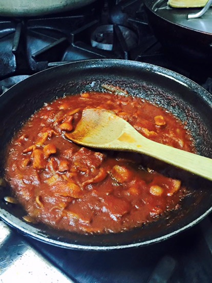 Es el momento de colocar el picante al gusto y cuando el vino se evaporó totalmente, si se utilizarán los tomates pellati o passata, el tocino se quita del sartén y se conserva caliente por aparte o bien se puede hacer todo junto… En esa misma sartén se pone la Passata o pelati a cocinar para que absorba los olores del tocino, si se necesita se regulariza de sal y se deja cocer por al menos 15-20 minutos más. En todo caso, si tienen la salsa ya lista como hago yo, dejan el tocino en la sartén y agregamos la salsa de tomate directamente dejando que se mezclen todos los ingredientes.