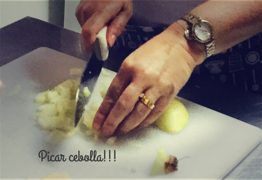 En un sartén antiadherente, colocar un chorrito de aceite de oliva y comenzamos a cocinar el tocino (mejor si no es ahumado), moviéndole de vez en cuando para que la cocción sea uniforme, la parte grasosa del tocino (blanca) tiene que quedar transparente. Yo en ese momento agregó media cebolla blanca y la dejo cristalizar junto al tocino como un sofrito.