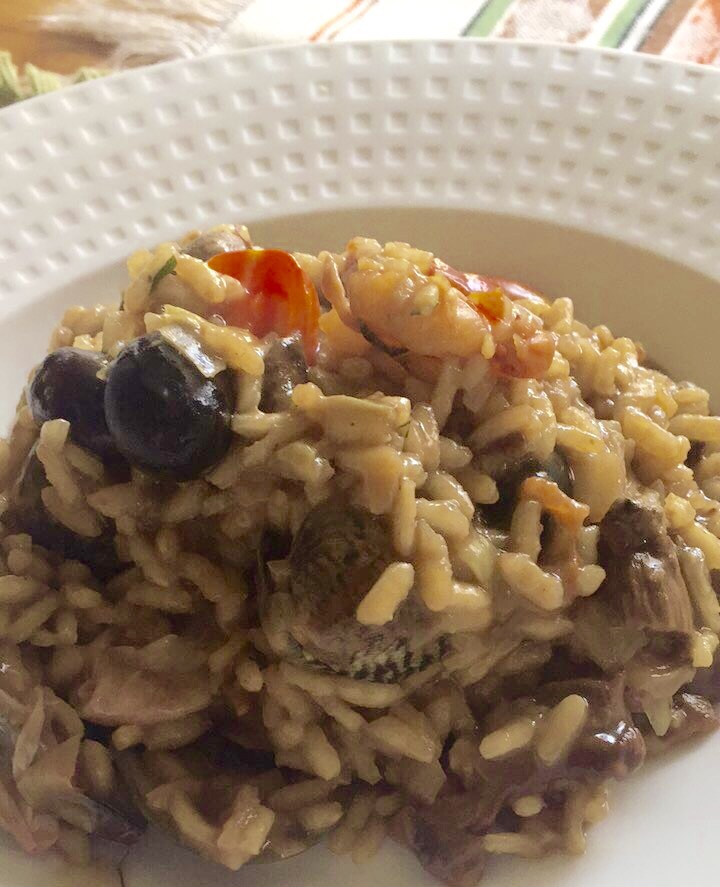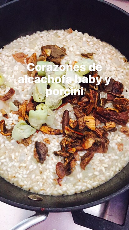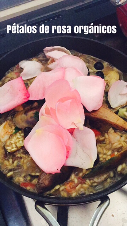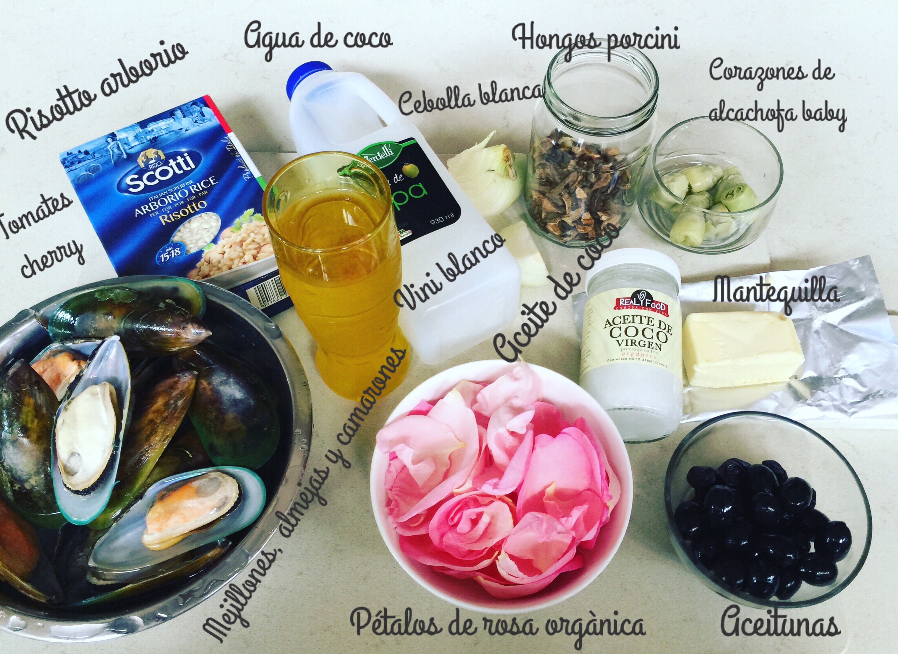 Un Risotto que me encanta por su elegancia y delicado sabor es el de pétalos de rosa y prosecco!!! Pero hoy tenía ganas de variarlo y tenía unos mariscos en el refri y corazones de alcachofa baby y porcini que se me antojaron y así me decidí en hacer un Risotto «mare e monti» pero con mi toque especial y original usando el aceite de coco y pétalos de rosas 😉