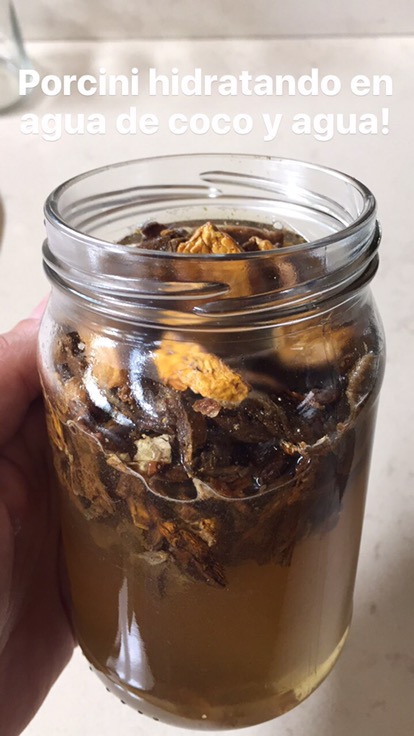 Mientras tanto hidratamos los hongos en el agua de coco que calentamos en el micro si desean.