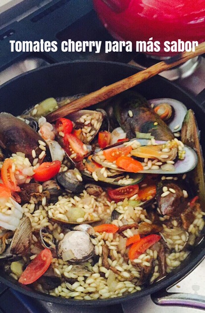 Seguimos hidratando alternando algún líquido… Y seguimos con los tomates cherry cortados en mitades y los frutos del mar que habíamos conservado.