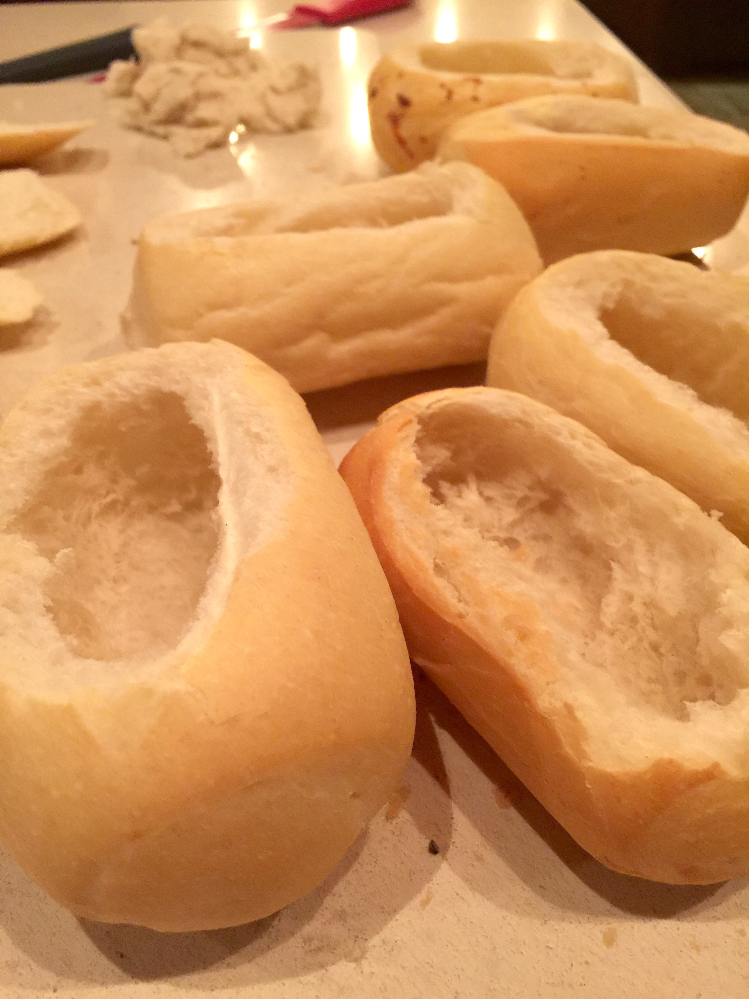 Lo primero será tomar el pan, con cuchillo de cierra cortar la parte de arriba, guardarla y quitar la miga de cada pan teniendo cuidado de no romperlo o dejarlo demasiado delgado.