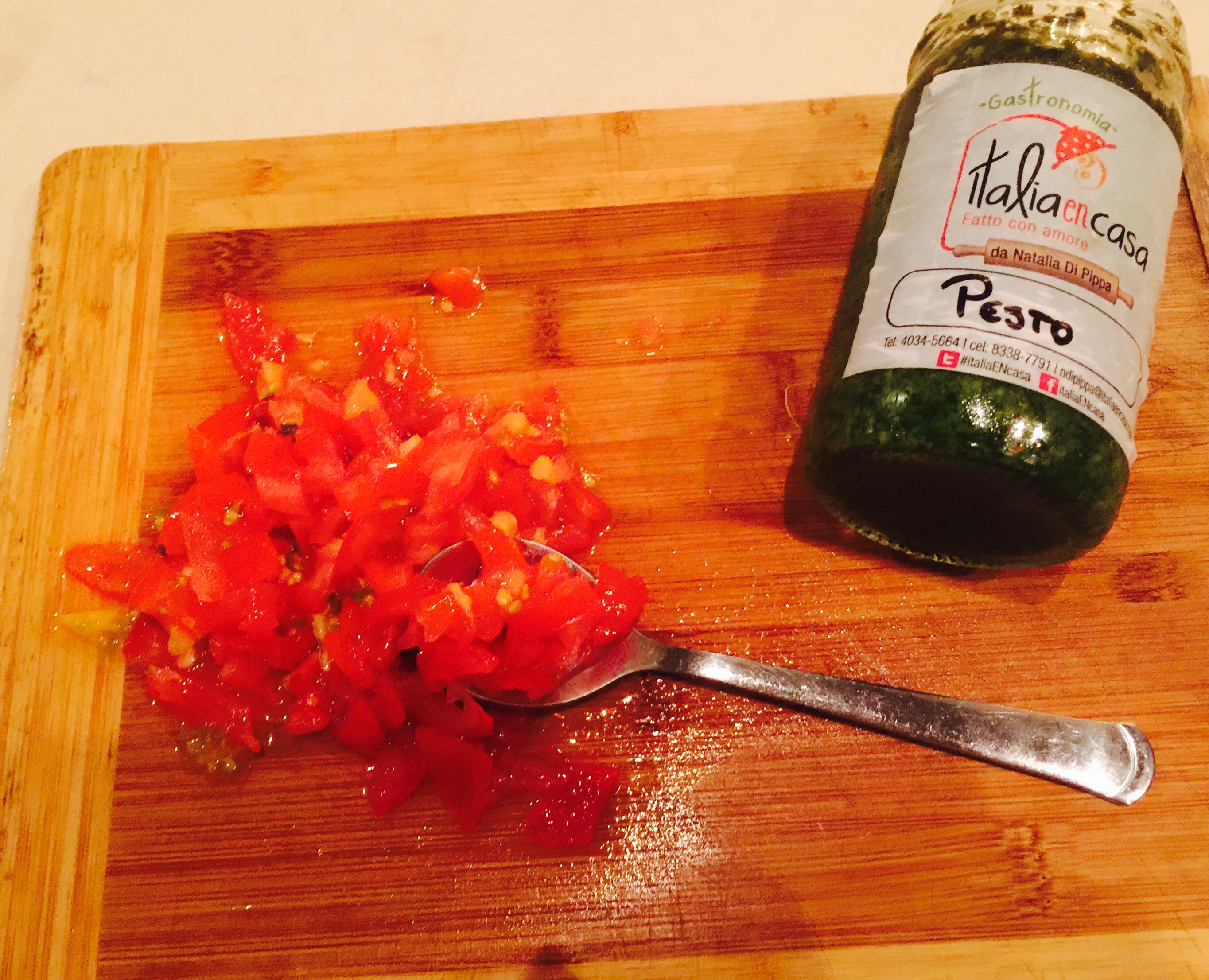 Mientras se van cocinando los pancitos en el horno, aprovechamos para ir cortando los tomates súper finito en brunoix (como para bruschetta) y sacas del refri el pesto que hacemos en la Gastro (ese lo tienes que comprar o te lo llevamos a casa.