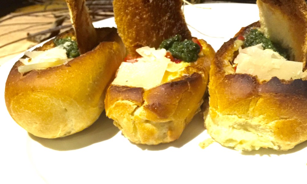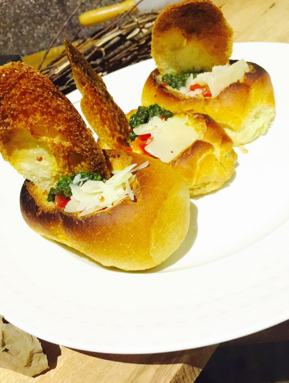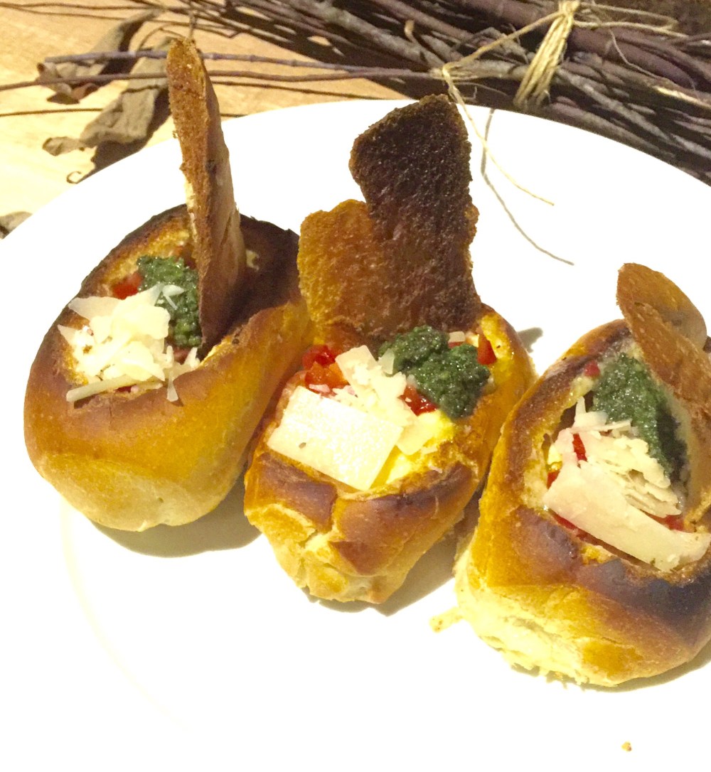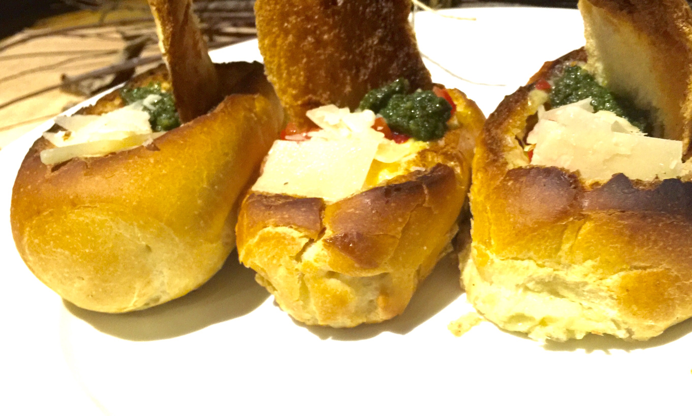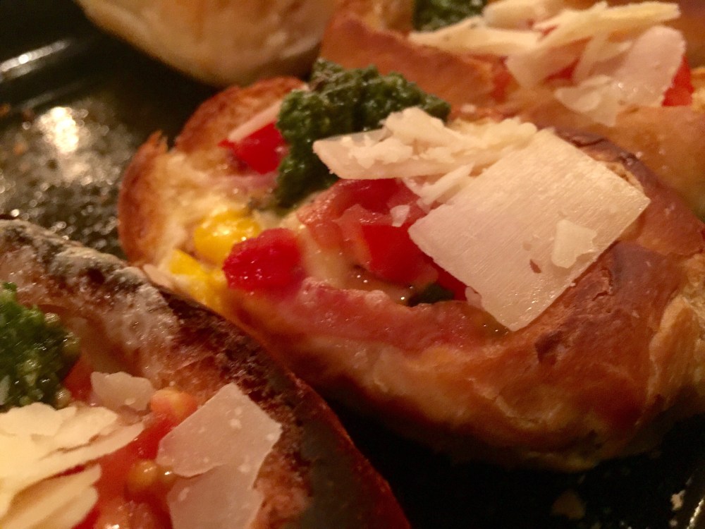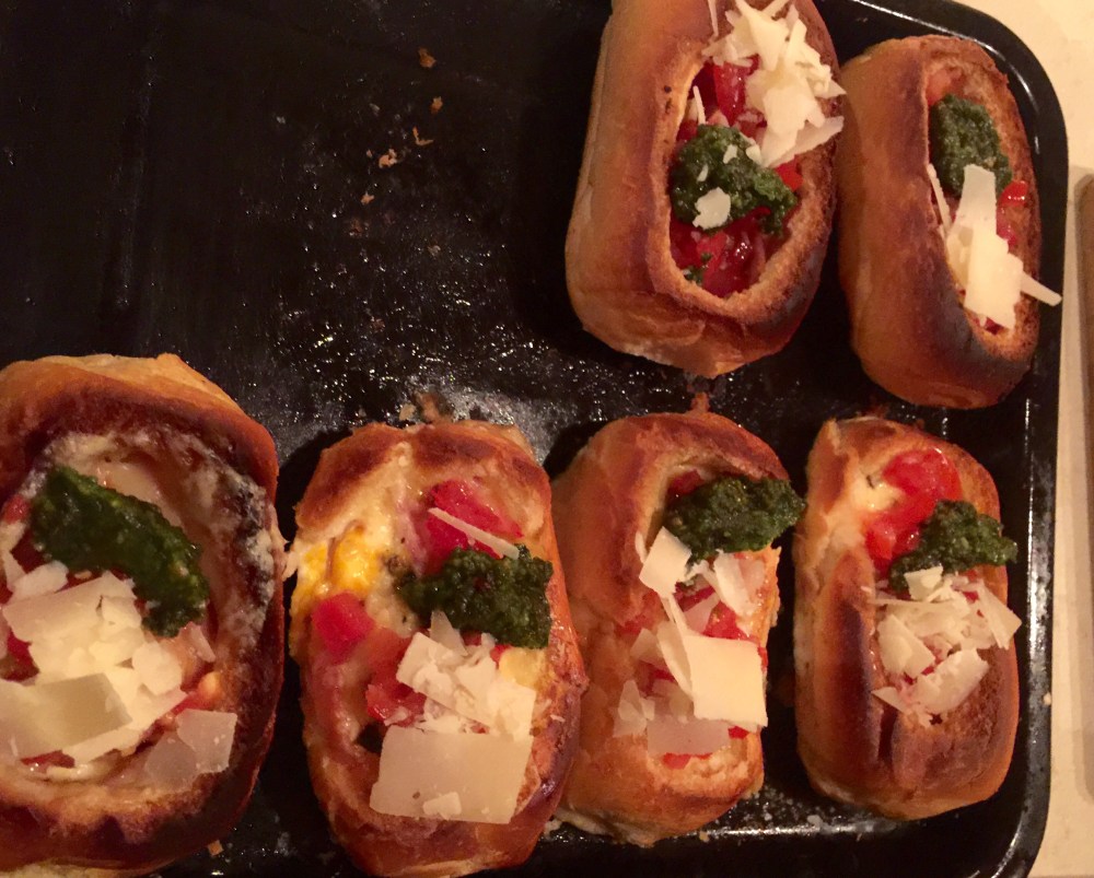 Sacamos los pancitos del horno y comenzamos a poner un poquito del tomate sin el jugo, un poquito de pesto y el Grana Padano o Parmigiano es lascas para decorar y dar más sabor!