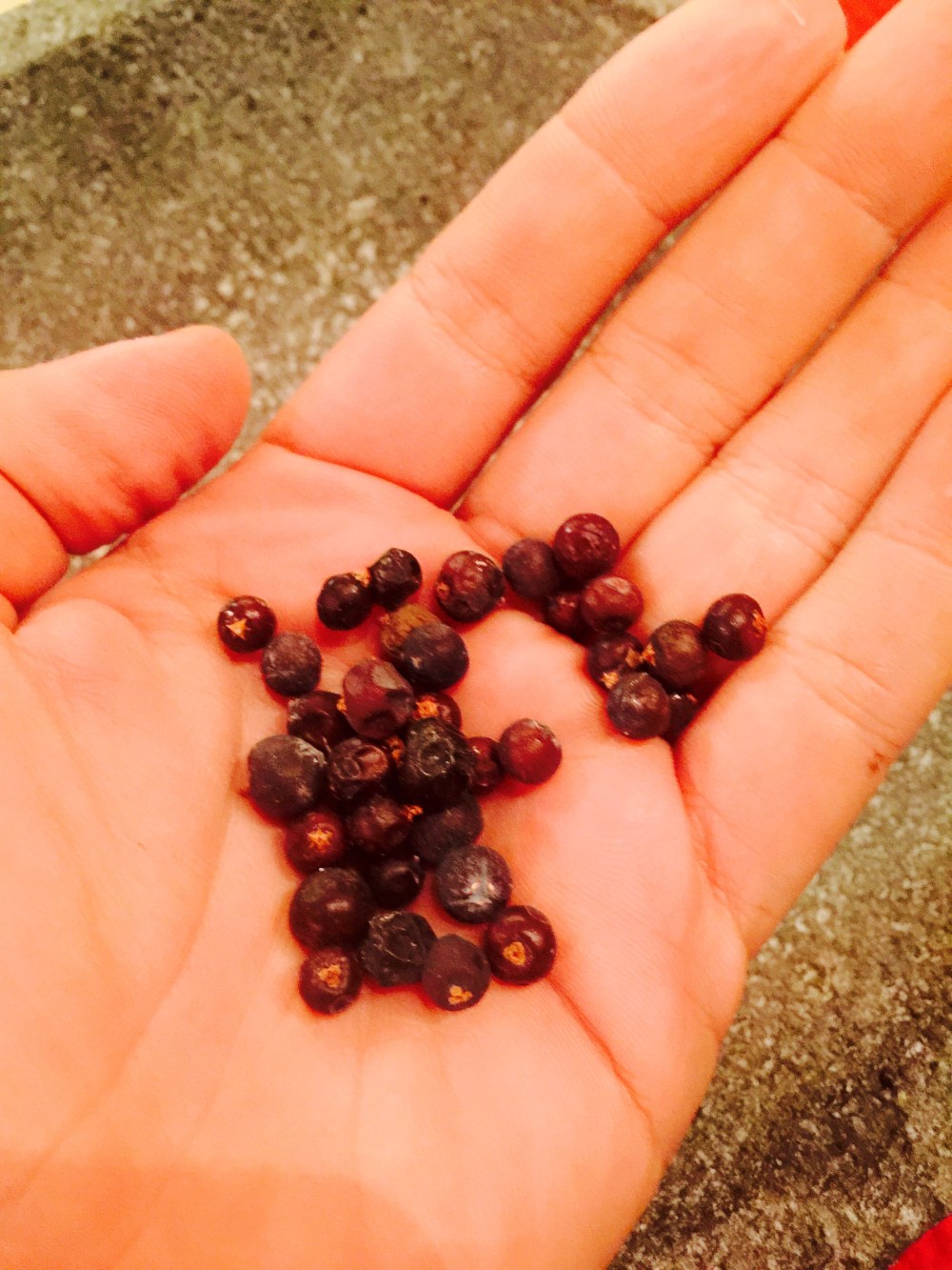 Los otros ingredientes que utilizaré serán las bayas de enebro (Ginepro) son unas pelotita que parecen como una pimienta que sabe a flores y también agregaré el cardamomo verde (abrimos cáscara y sacamos semillas) Las amo! Y las machacamos ambas en mortero de piedra.
