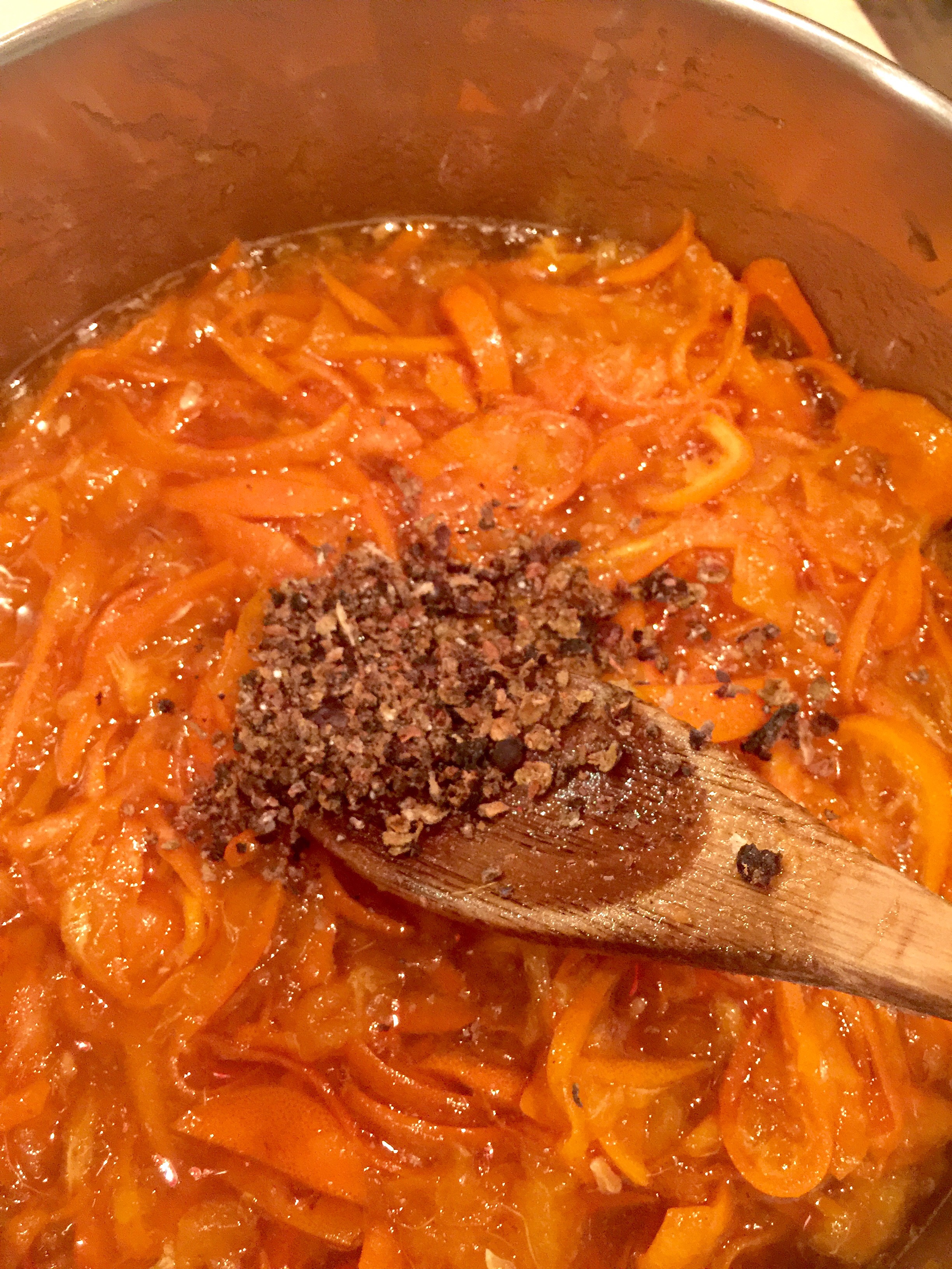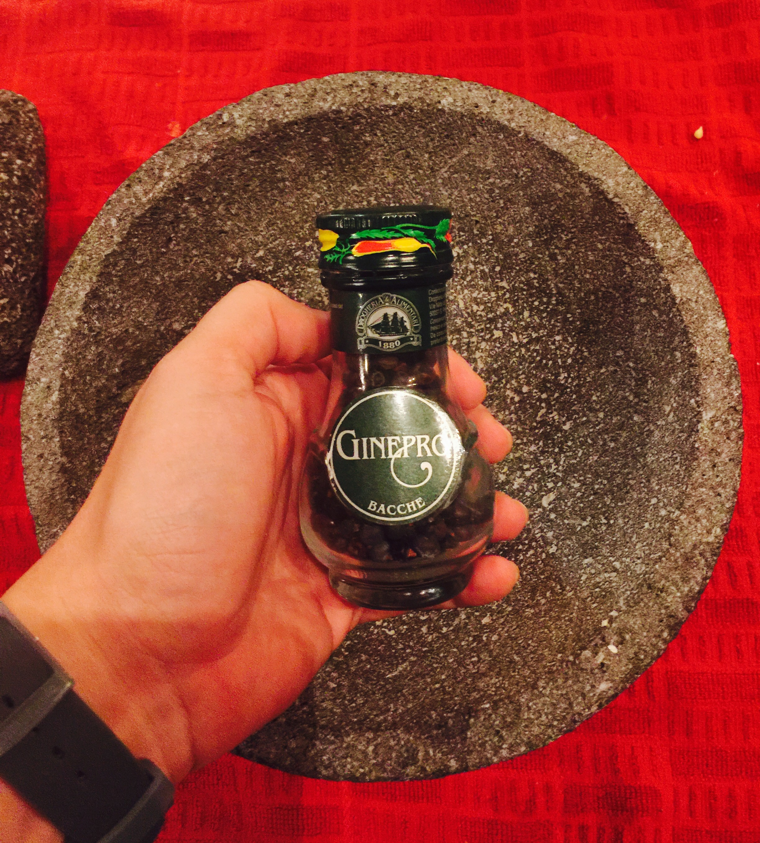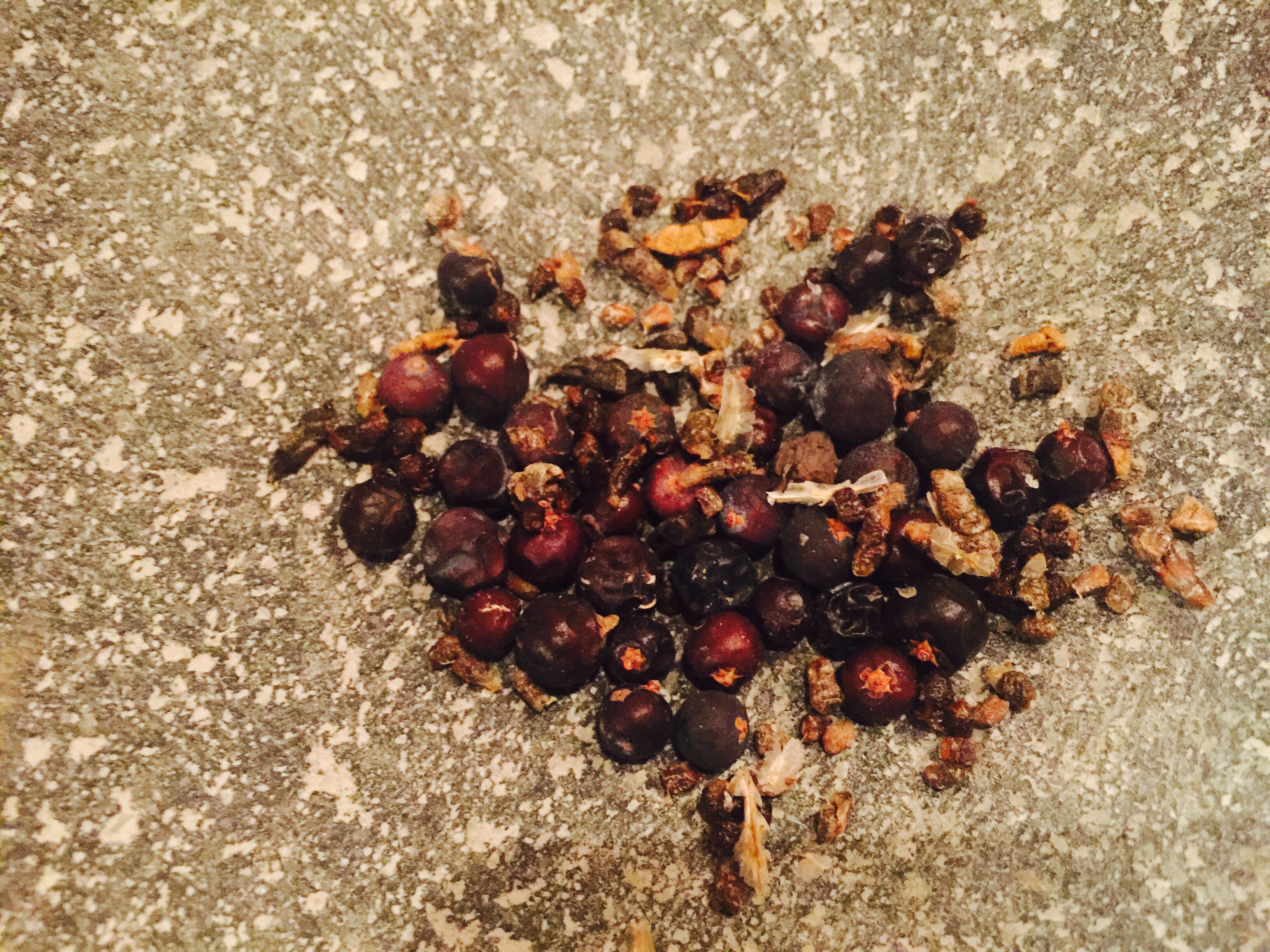 Los otros ingredientes que utilizaré serán las bayas de enebro (Ginepro) son unas pelotita que parecen como una pimienta que sabe a flores y también agregaré el cardamomo verde (abrimos cáscara y sacamos semillas) Las amo! Y las machacamos ambas en mortero de piedra.