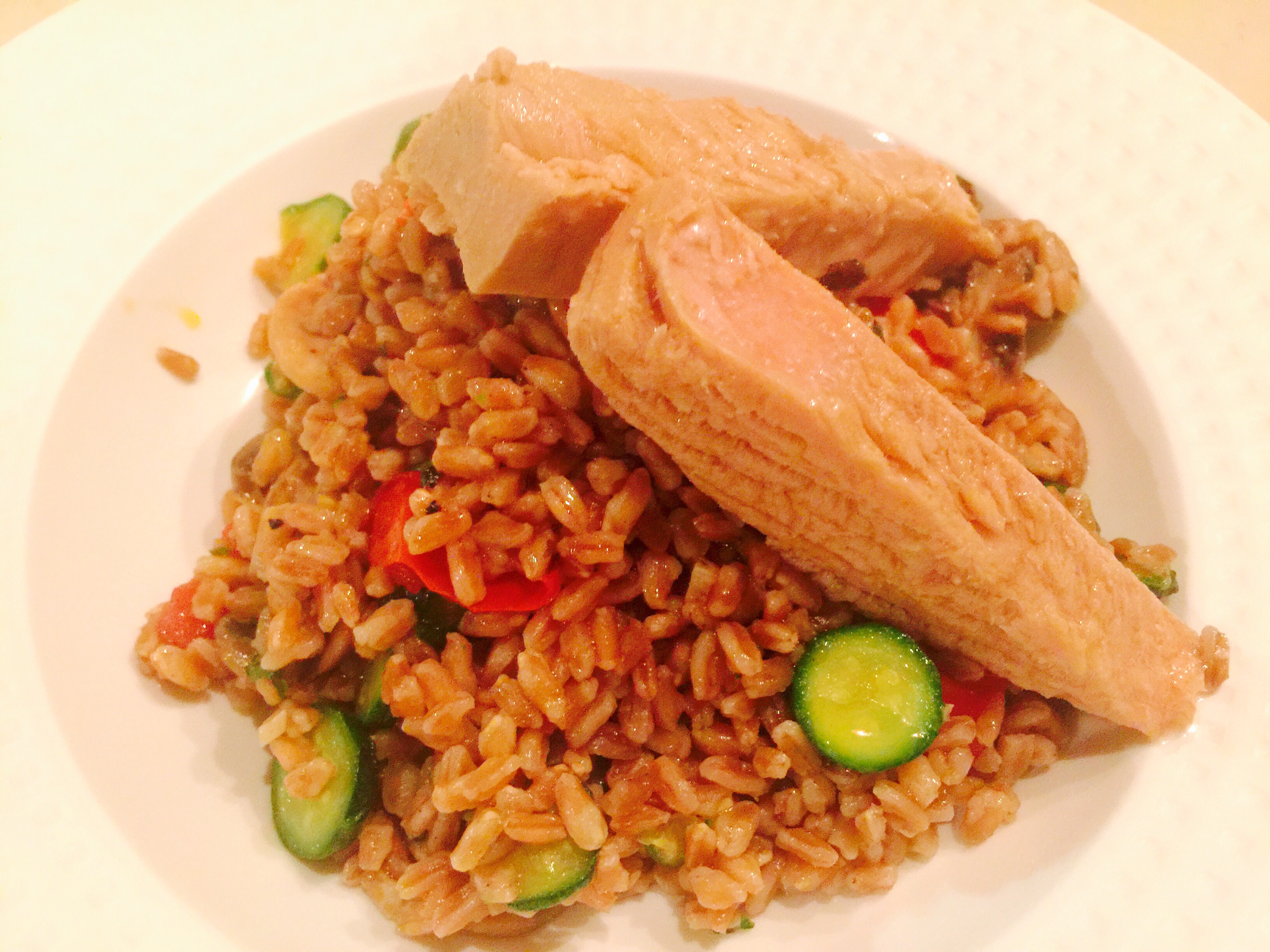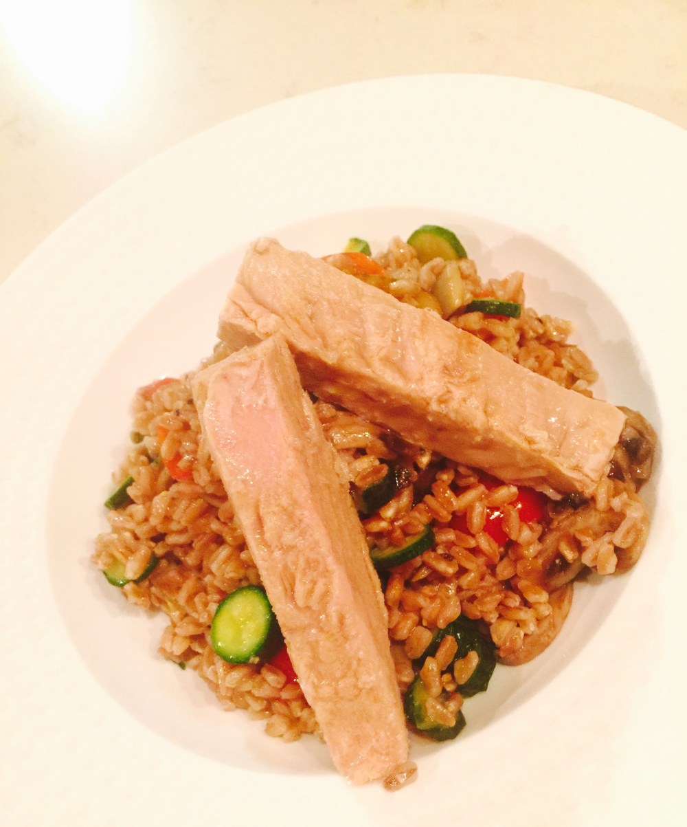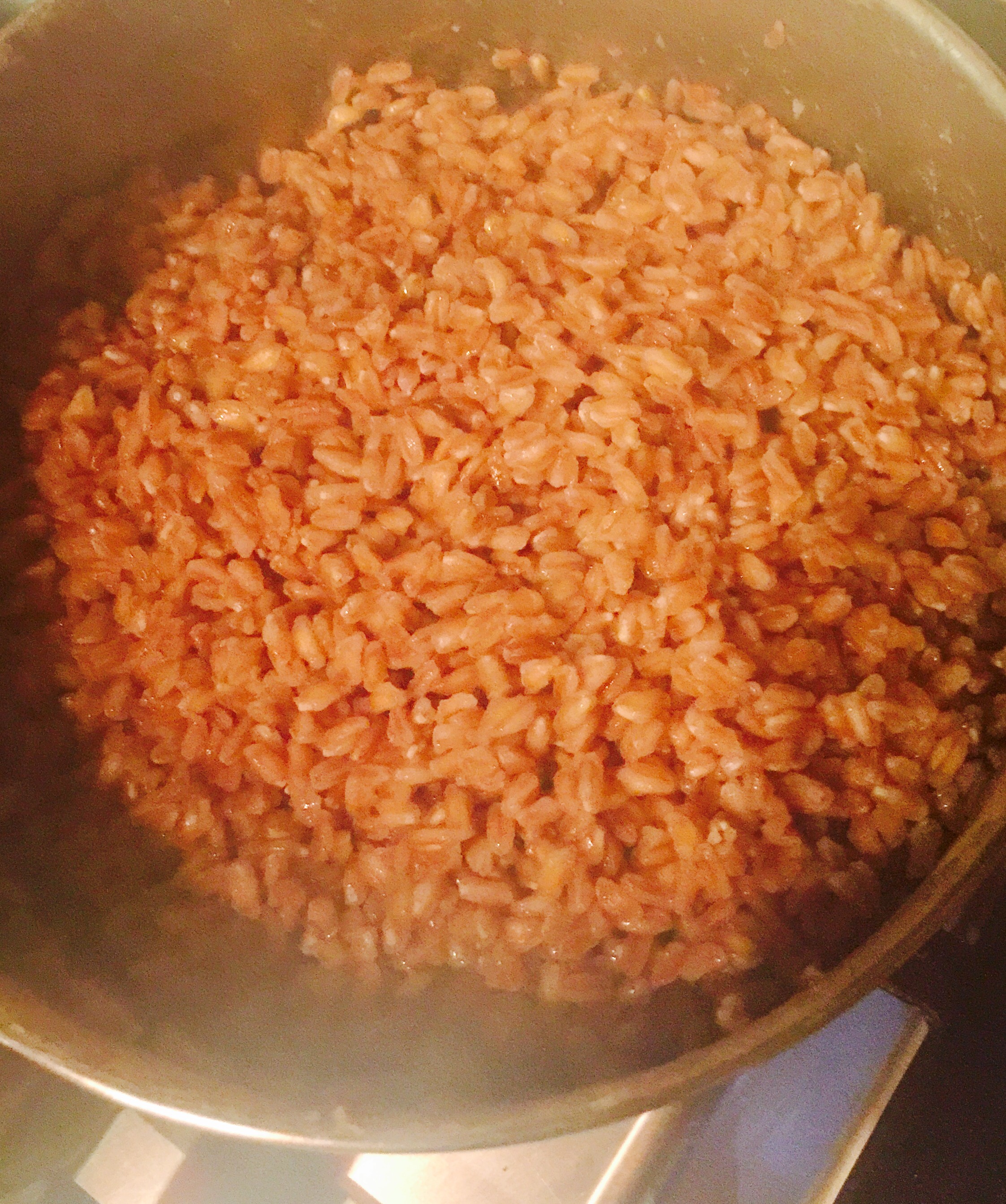 Empezamos lavando el farro bajo agua fría y procedemos a cocinarlo como si fuera arroz o pasta (están muchas otras ormas de hacerlo), en mi caso puse agua con sal y puse a hervir el farro, el mismo absorbió todo el agua, como si fuera arroz, lo dejé unos 30 a 35 minutos revolviendo de vez en cuando, al finalizar la cocción le puse un chorrito de aceite de oliva, pimienta y nivele de sal. Lo dejo enfriar al tiempo!