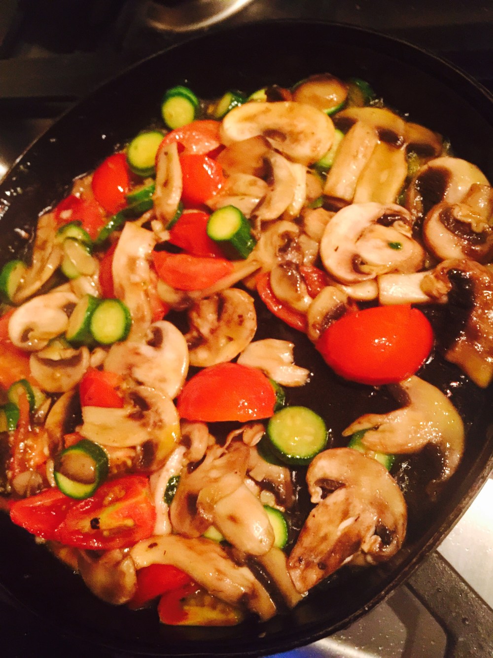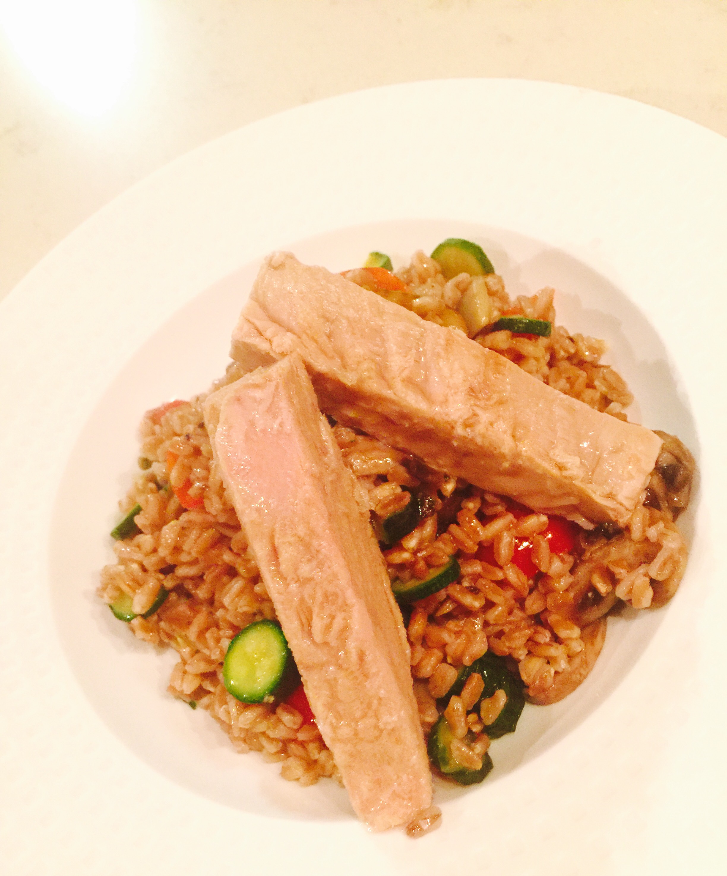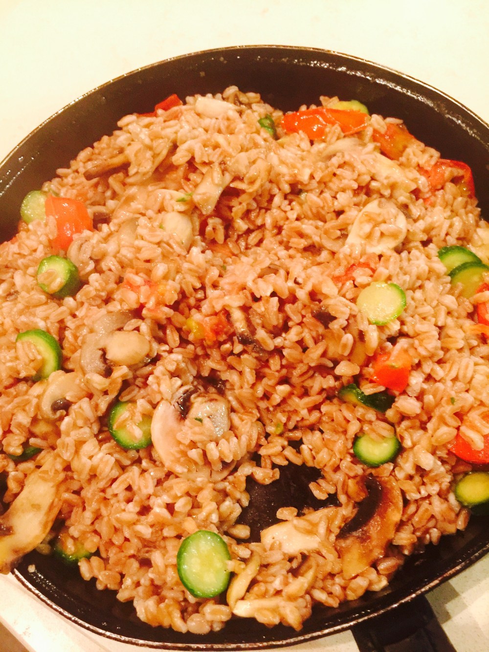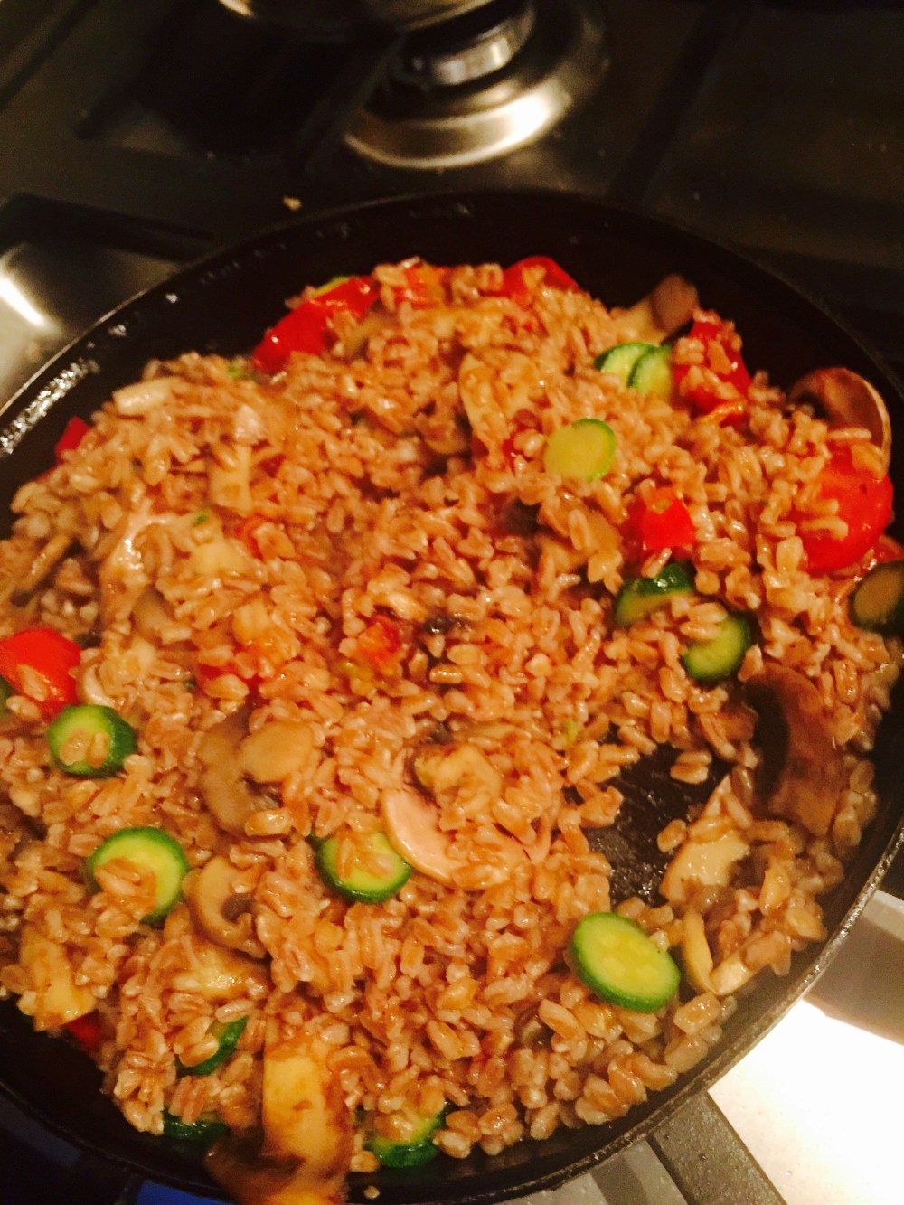 Procedemos a incorporar el farro previamente cocido y mezclamos ingredientes en el mismo sartén saltando unos minutos más, si se desea se puede agregar un poco más de aceite de oliva puro extra virgen si se desea más húmedo.