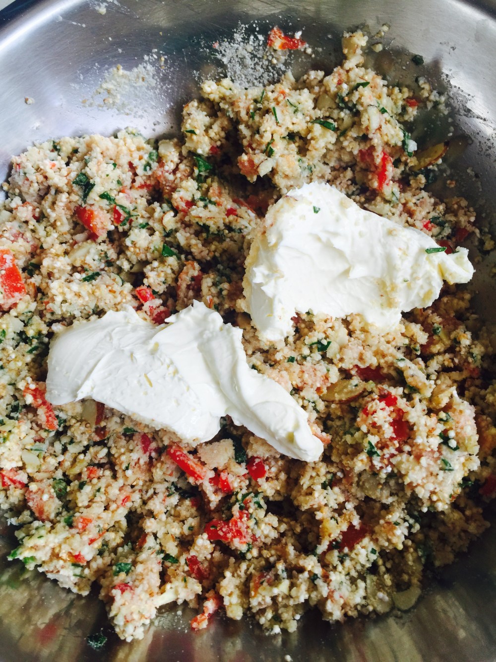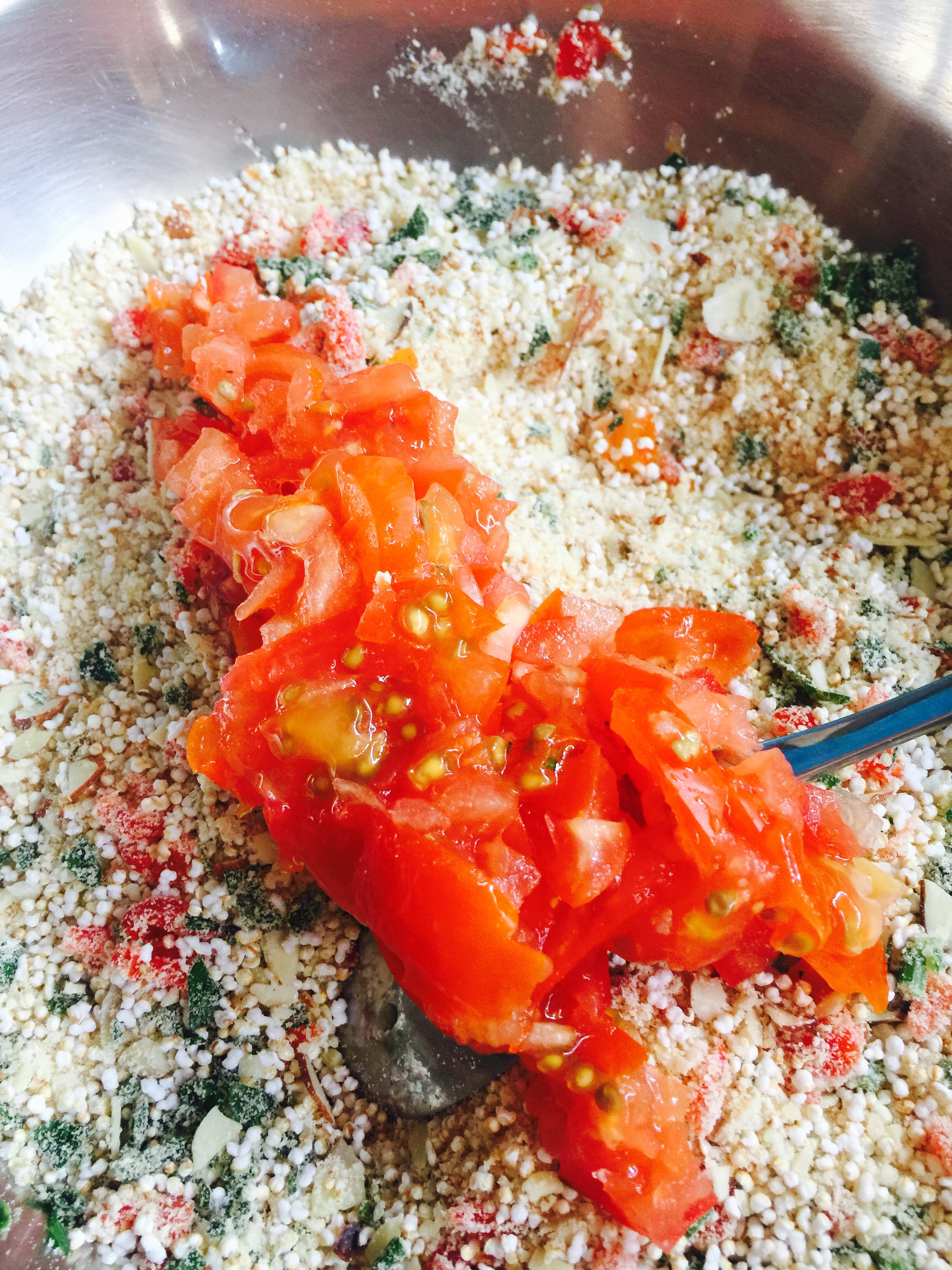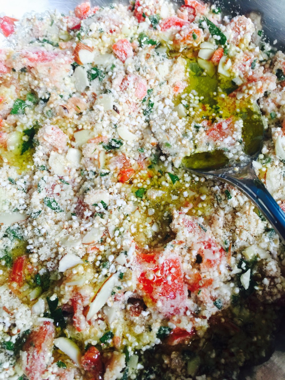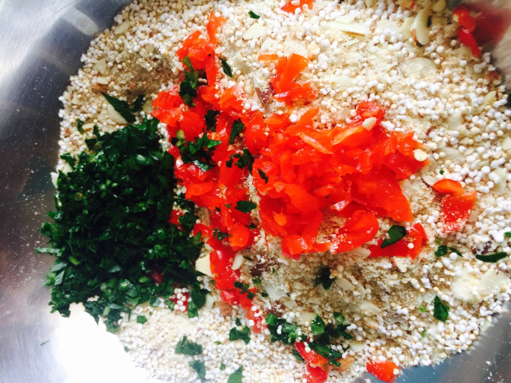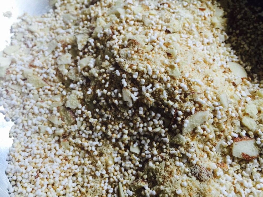 Vamos con el relleno: en un bowl mezclemos todos los ingredientes secos: pan, parmigiano, amaranto y almendras.