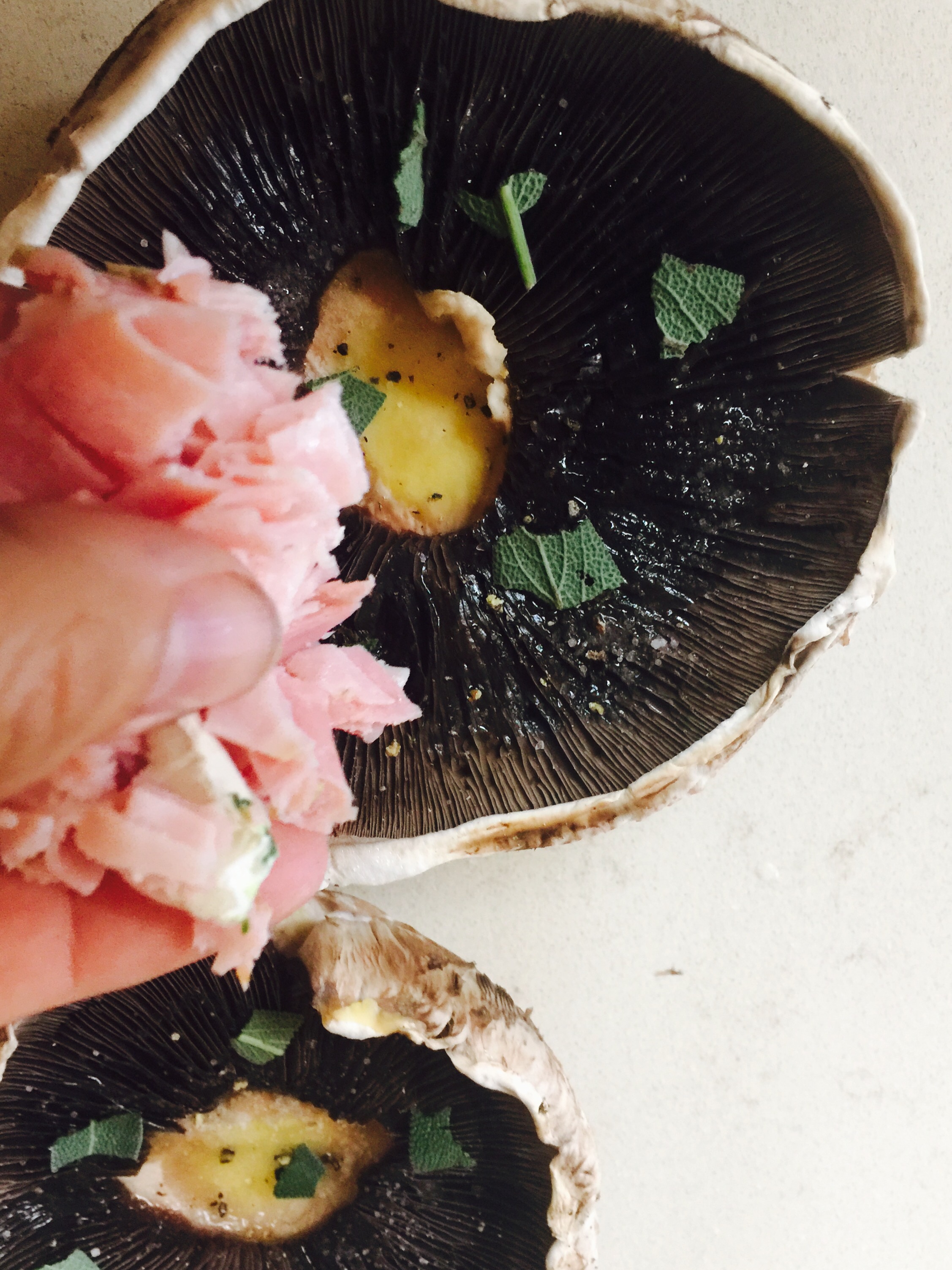 Corto finamente el jamón y con las manos las hojas de salvia y continuamos rellenando…