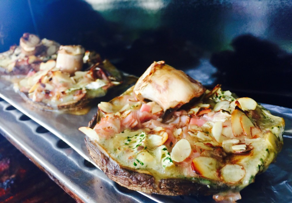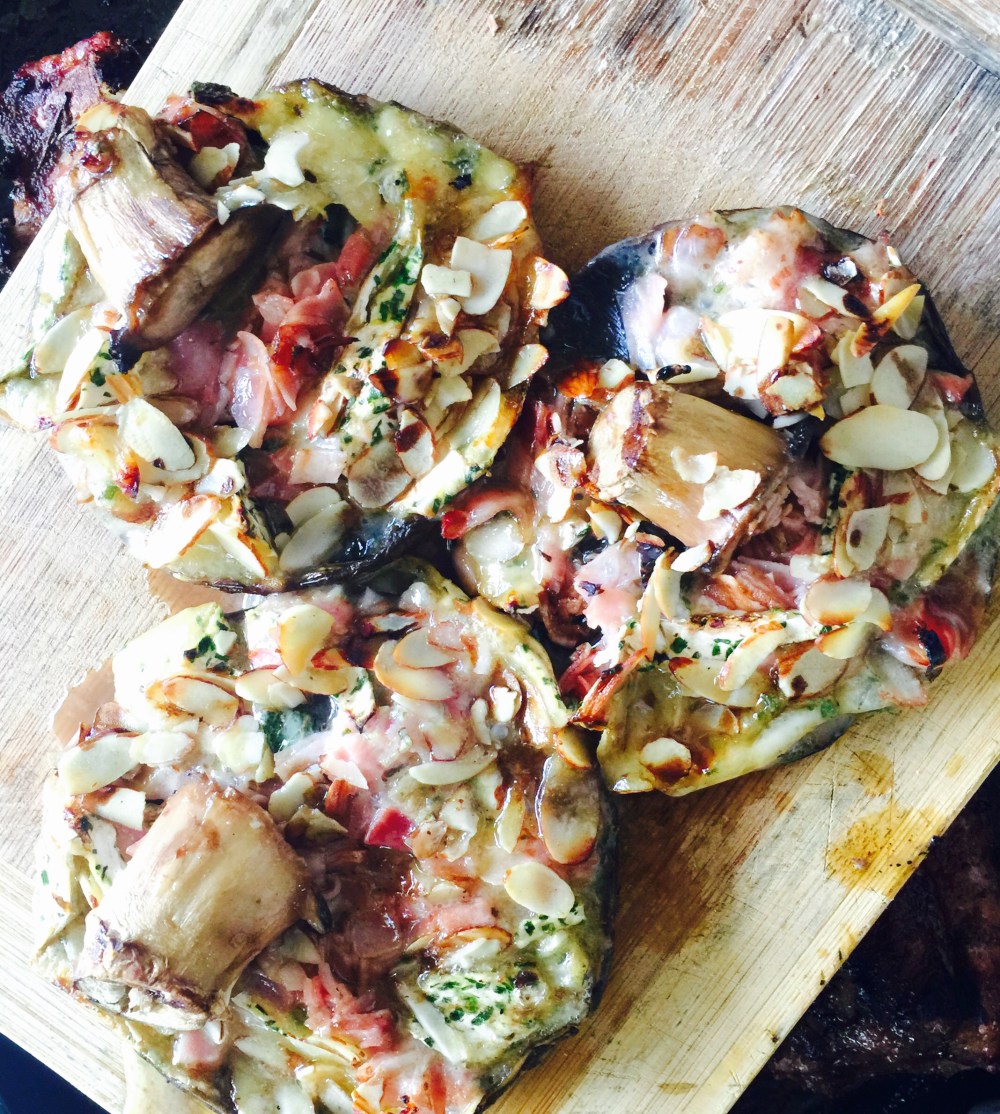 Lo dejo primero directamente sobre las brazas de la parrilla, cuando ya empieza a derretir el queso los pasó a la parte superior de la parrilla.