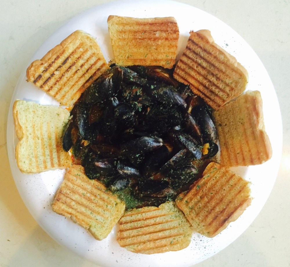 Cuando esté listo el pan, procedemos a emplatar colocando los mejillones con su salsa caliente y colocar los crostinos de pan al rededor.