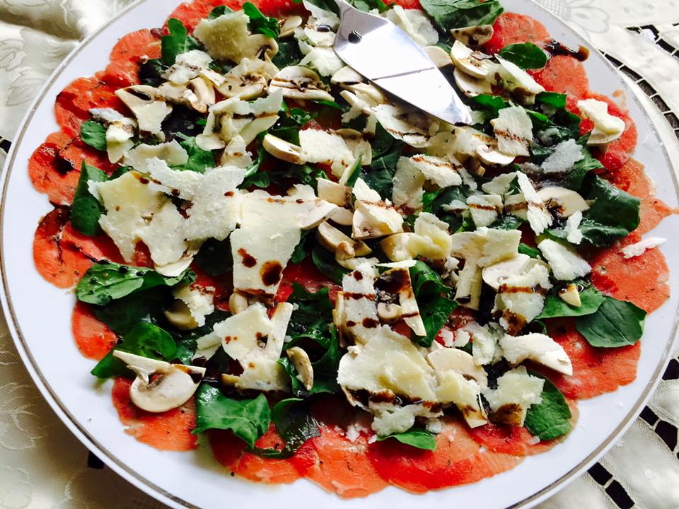 El original Carpaccio es hecho de carne de ternera cortada finamente, pero se puede hacer también de pescados, salmón, pulpo, vegetales y bien como la creatividad de cada cocinero lo amerita. Yo he creado muchas variantes, tantos de ofrecer una página completa de nuestro menú dedicado a «la Carpacceria». Me gustan las mezclas de frutas, quesos y proteínas 🙂 para personalizar y dar color un poco al plato uso albahaca, menta o hierbas frescas…