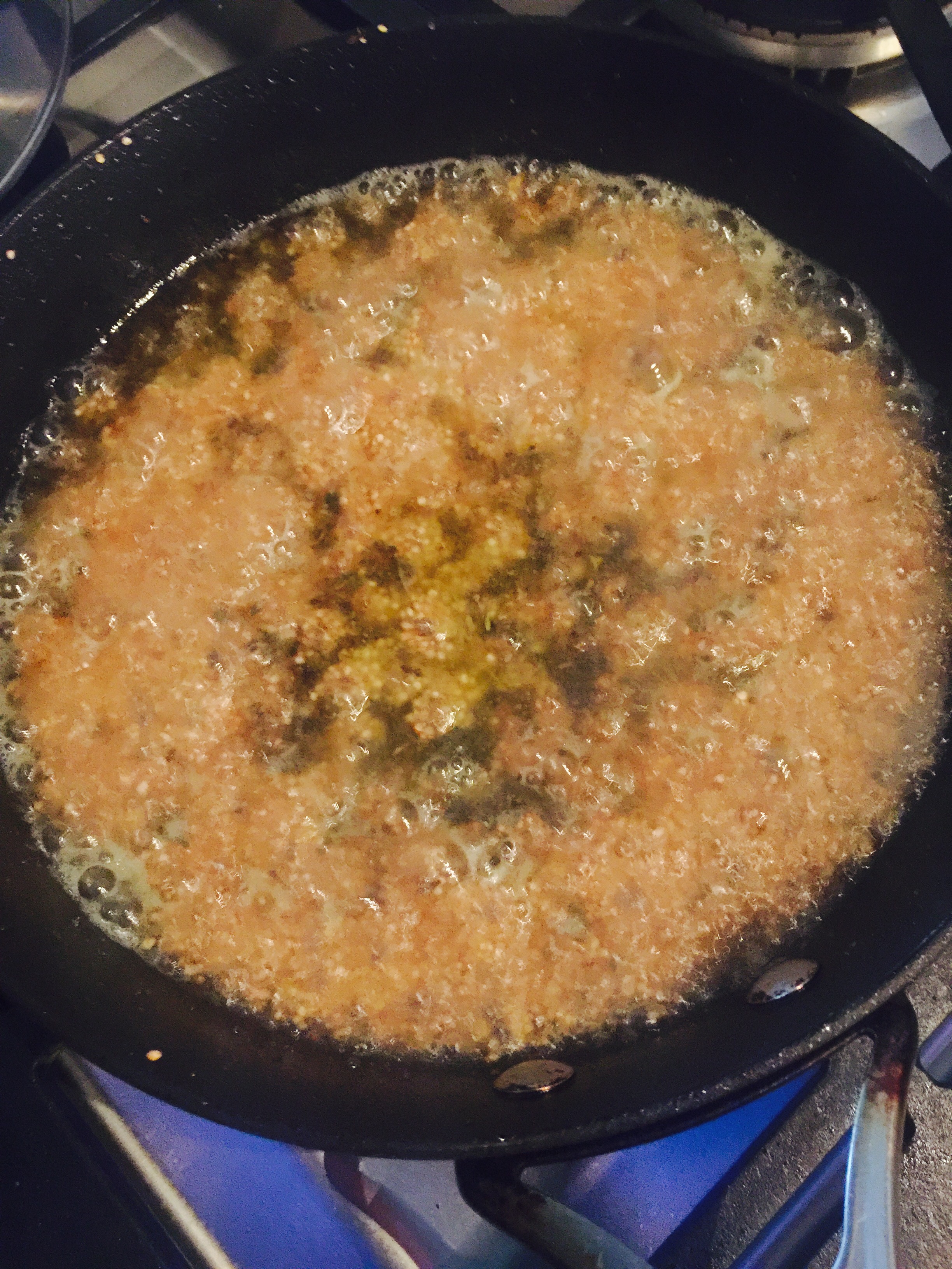 Comenzamos con tostar la quinoa en un sartén con unas 2 cucharadas abundantes de aceite de aguacate, le puse unas especias sicilianas que tenía, sésamo negro y lo dejé tostar unos 5 minutos (utilice una taza de quinoa)