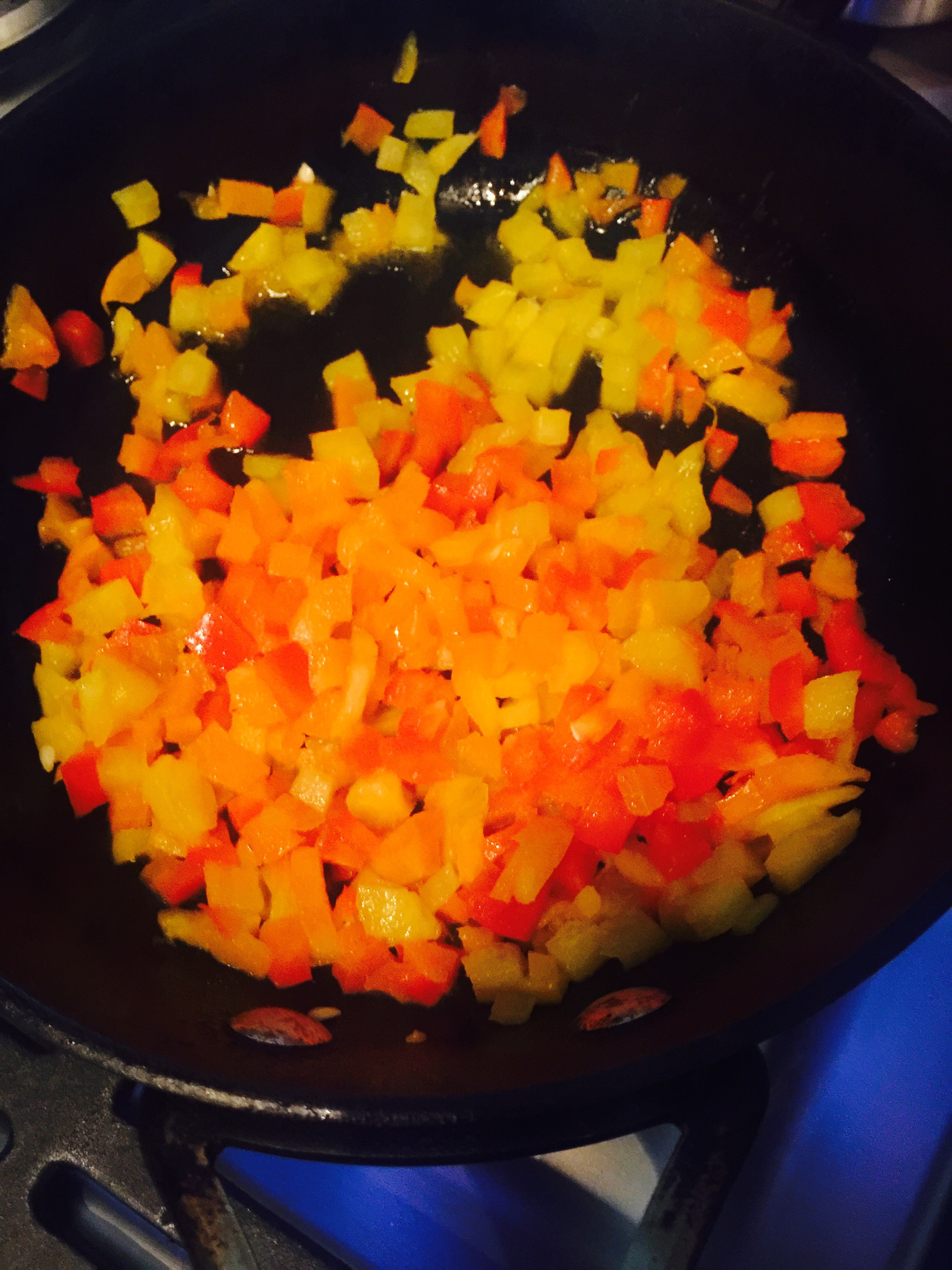 En otro sartén corté lo chiles mundiales (1/3 de cada uno) en cubos pequeños y los puse a dorar con un poco de aceite de aguacate, incorpore a media cocción los hongos y los evapore con vino blanco.