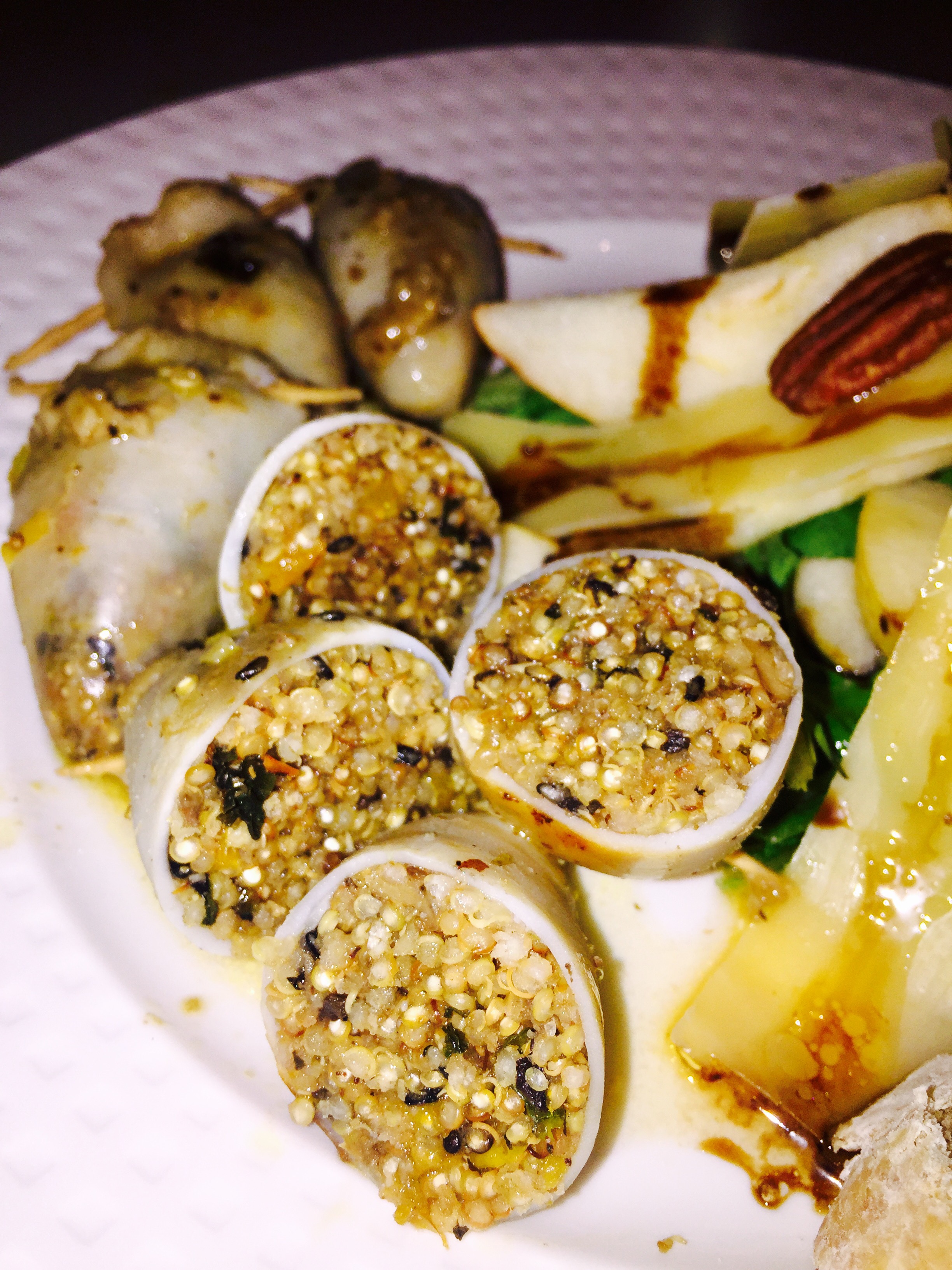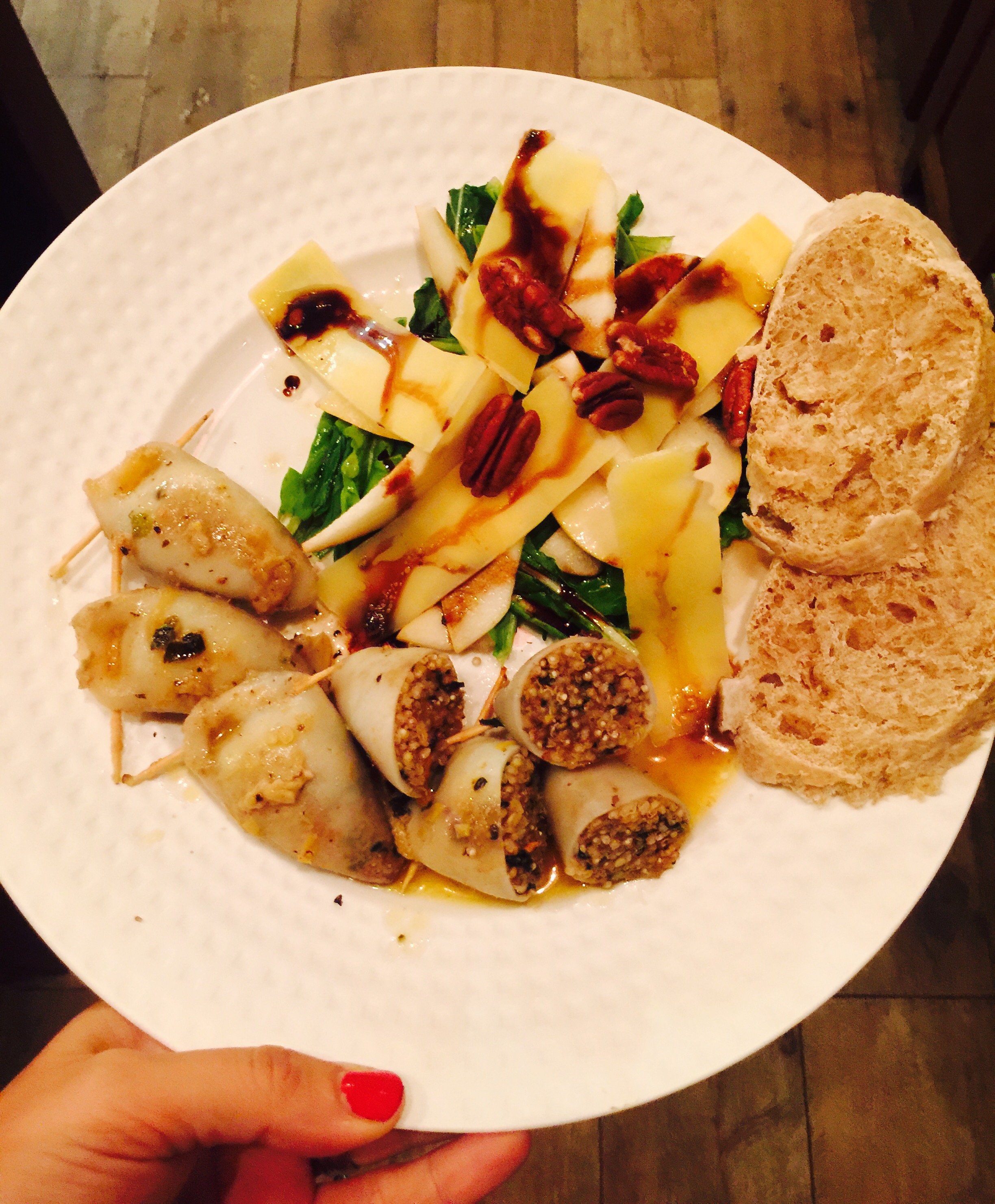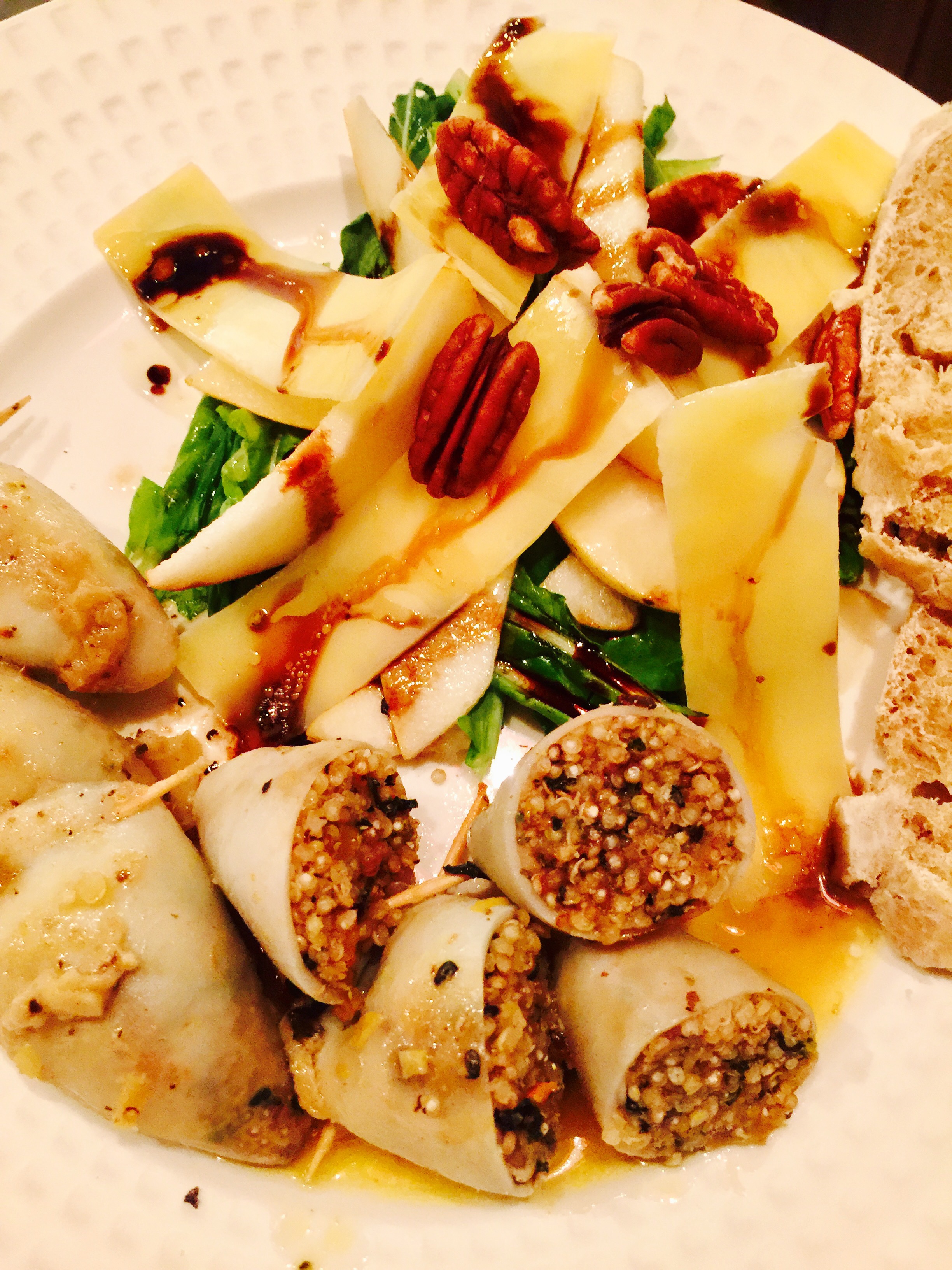 En un sartén grande puse un poco de aceite de coco orgánico, y comencé a cocinar por un lado los calamares (5 minutos) puse más ralladura y hierbabuena sal y pimienta, les di vuelta y deje cocinar otros 5 minutos.