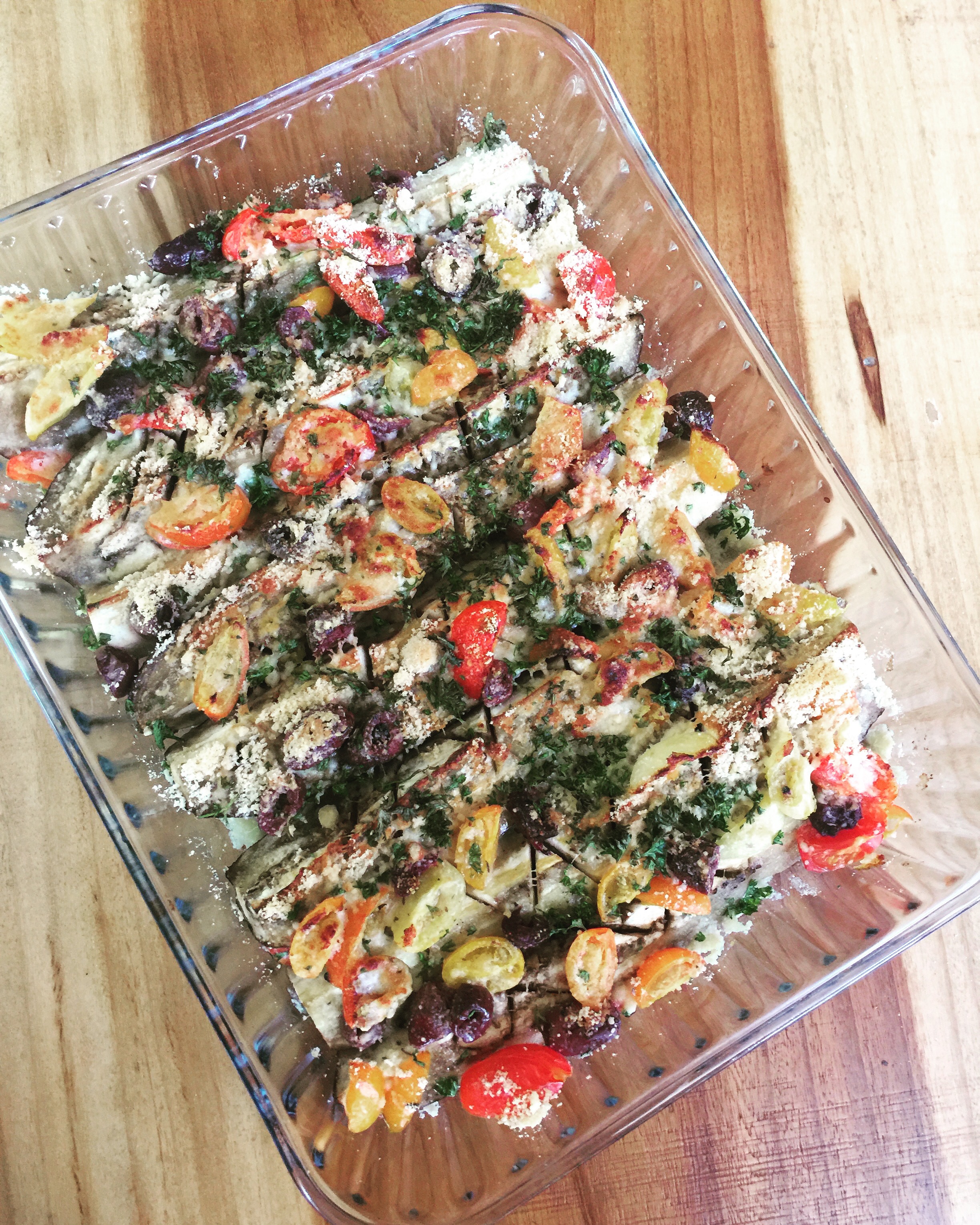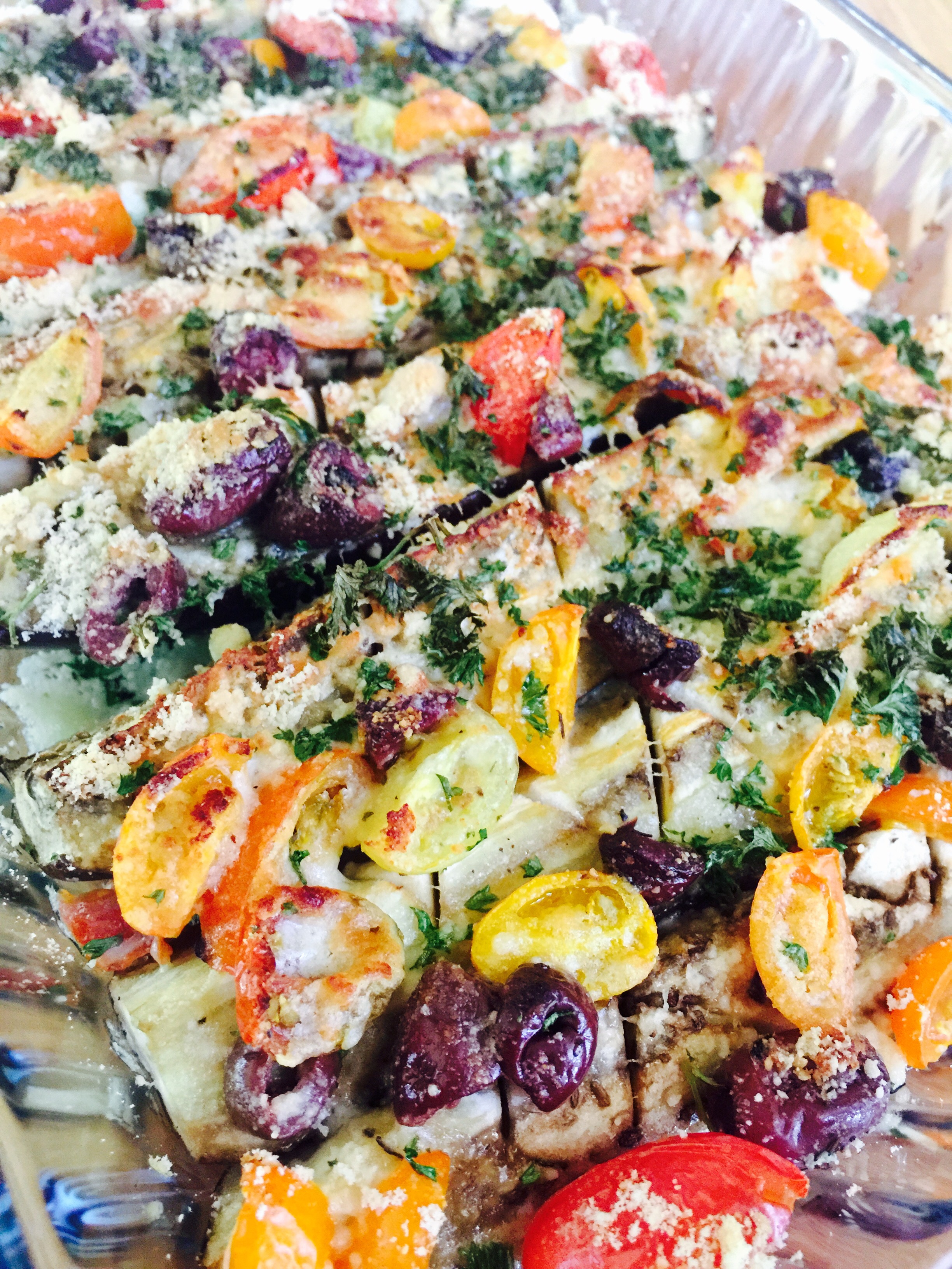 Continuamos posicionándo los tomates cherry de diferentes tamaños y colores junto con las aceitunas negras distribuyéndolas a lo largo de las berenjenas.
