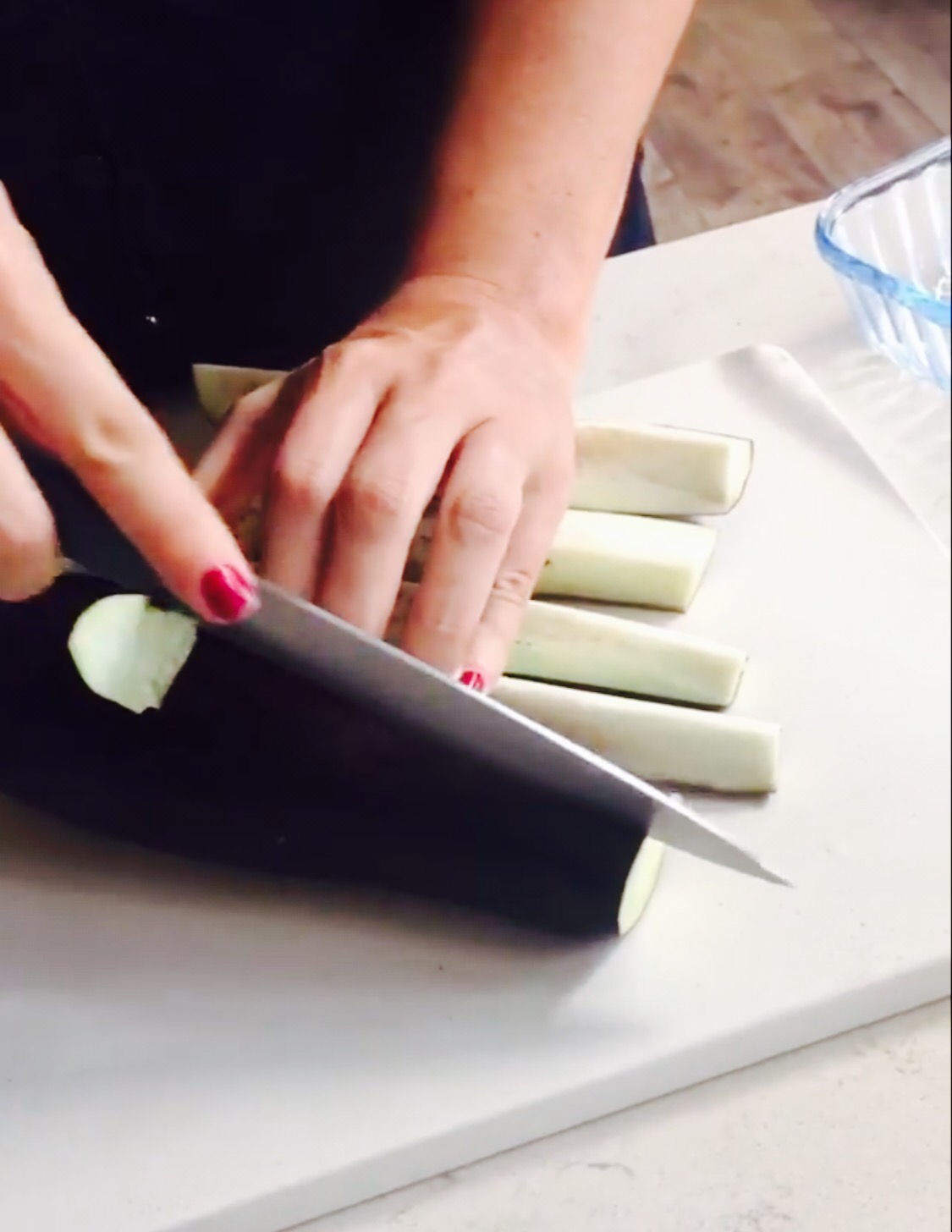Realizamos ahora cortes transversales a lo largo de las berenjenas para que puedan penetrar los sabores, procurar no llegar hasta la cáscara… y seguimos salando y pimentando al gusto.