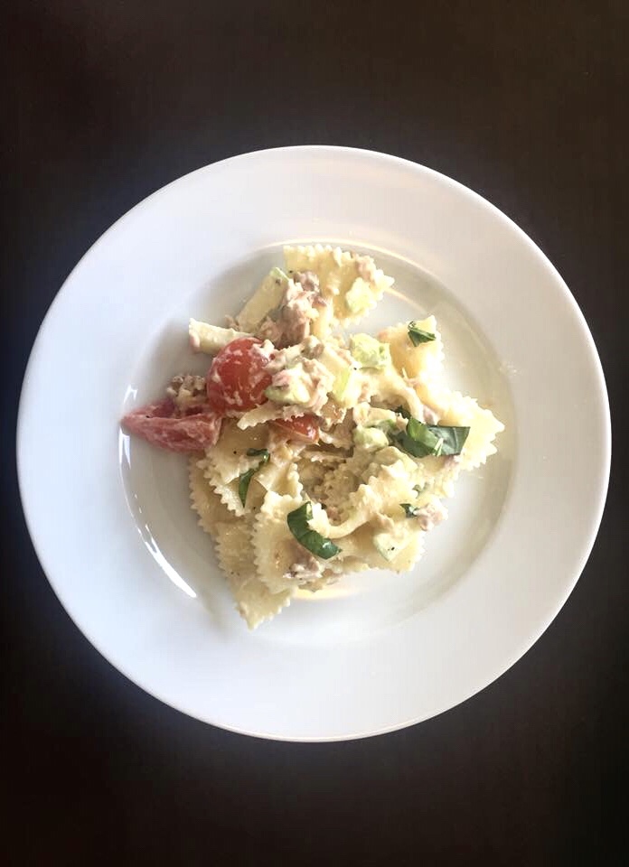Una vez que la pasta esté fría (podemos ponerla tapada con plástico en Refrigeracion para acelerar el proceso) comenzamos a incorporar los demás ingredientes: primero el atún y mezclamos, luego las manzanas y mezclamos, los tomates y mezclamos, finalizando cortando el aguacate e incorporándolo.