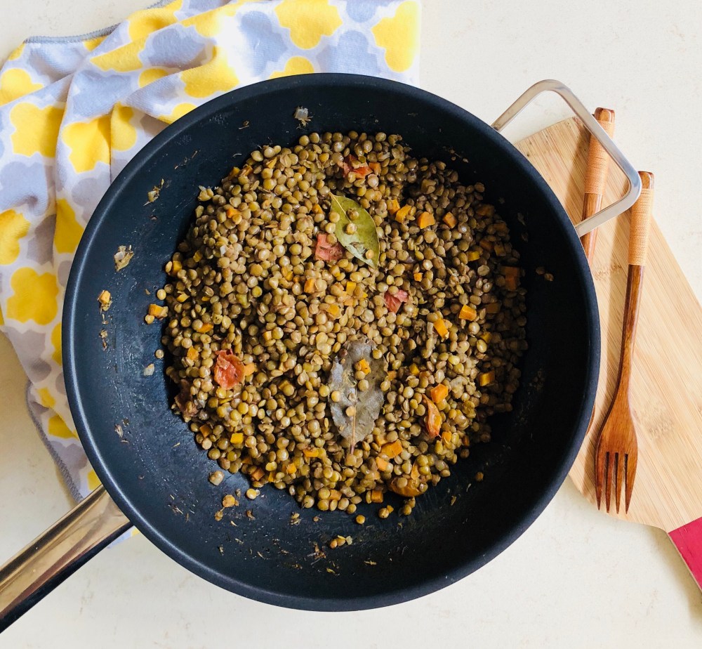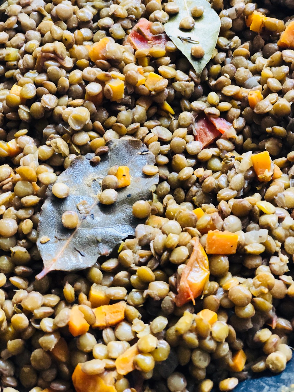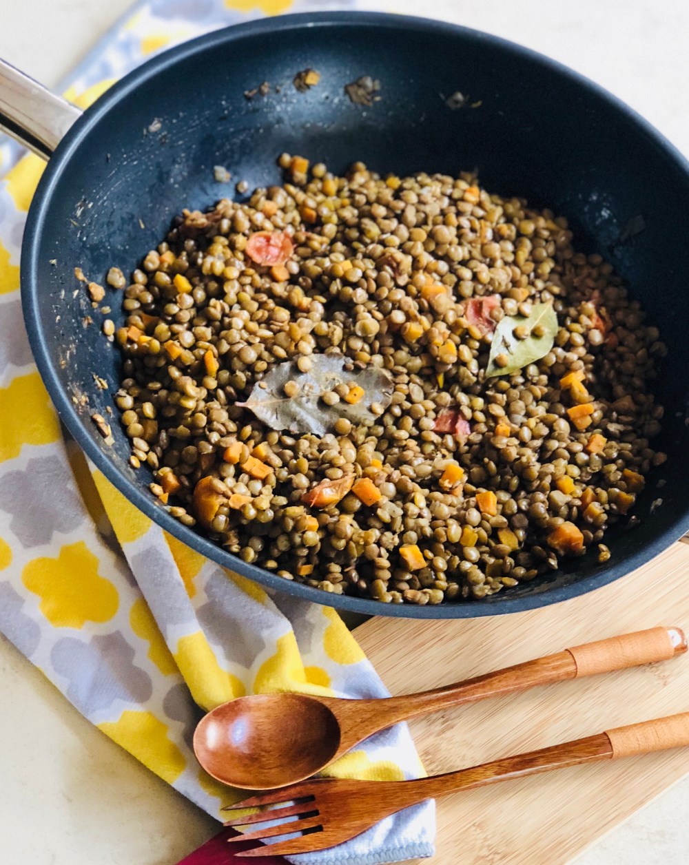 En una sartén amplía colocar un poco de aceite de oliva y sofreír cebolla y zanahoria por un par de minutos. Agregar las lentejas con todo y el agua (hasta que queden cubiertas de 1 dedo de agua) colocar las hojas de laurel y sal pimienta tal gusto.