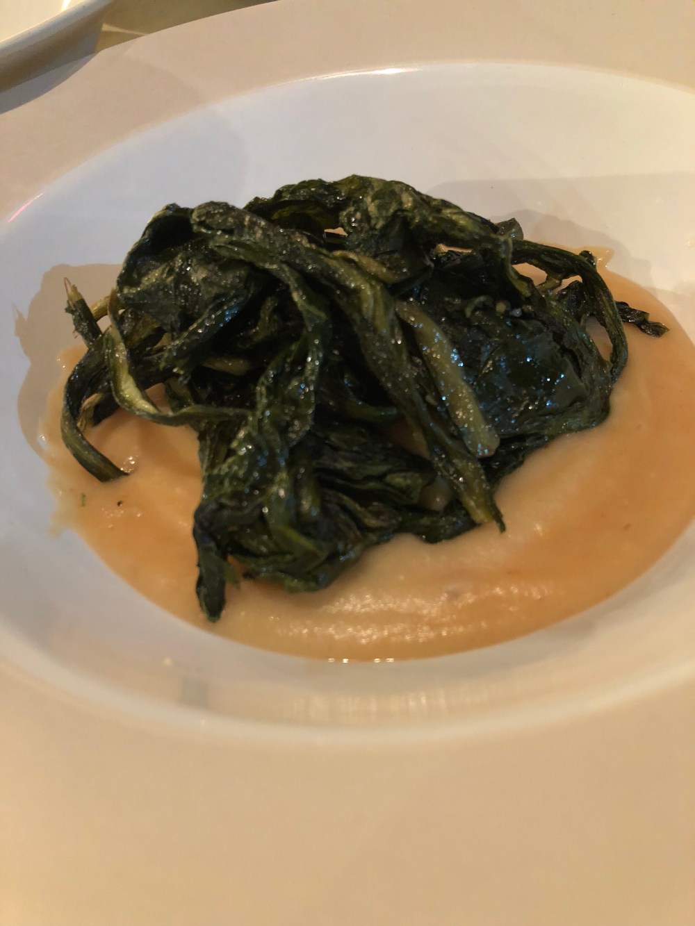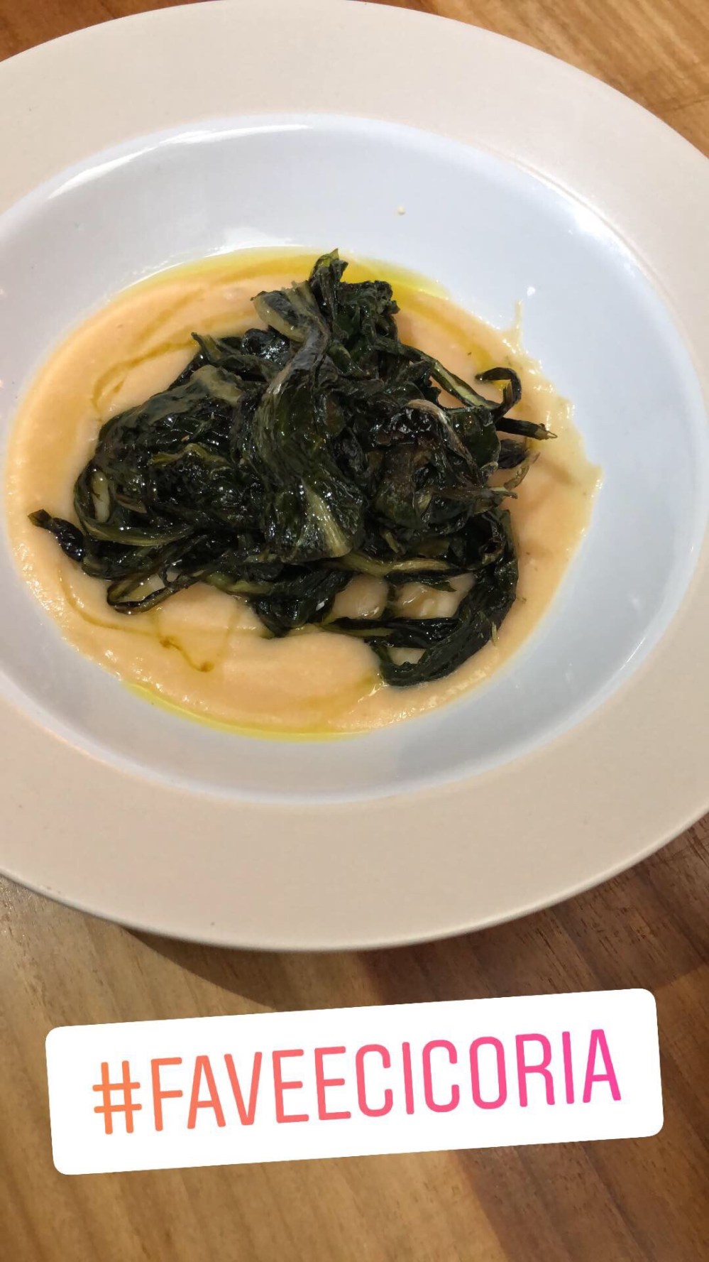 Una cama de puré de habas, sobre el colocamos la Cicoria y regalos todo con aceite de oliva de muy buena y alta calidad.
