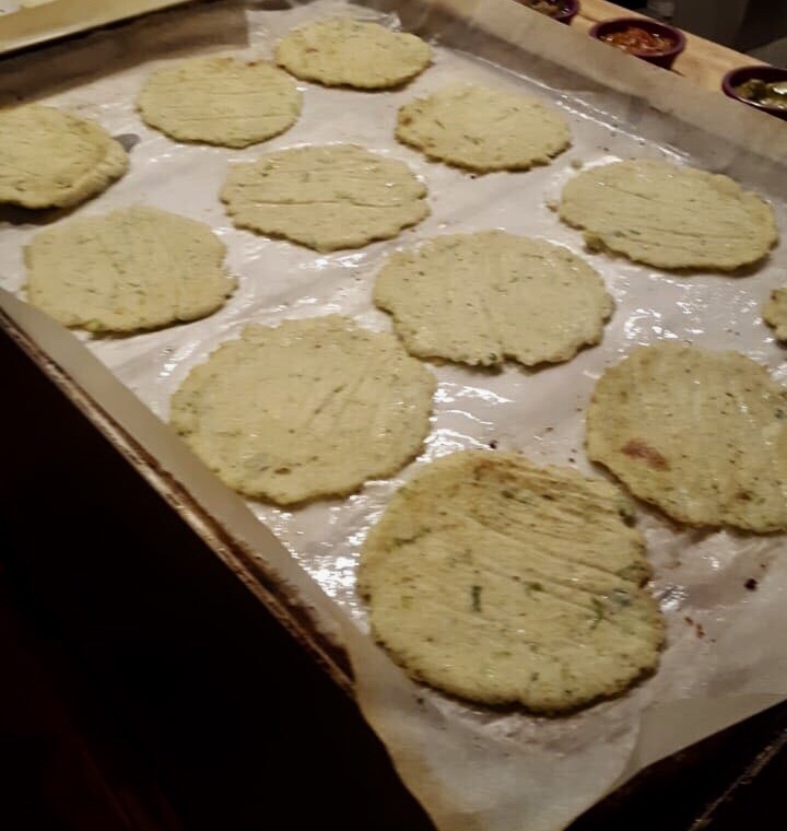 Precalentamos el horno, y colocamos en una bandeja parchpaper el cual podemos rociar con aceite en spray o bien en una servilleta ponemos aceite de oliva y lo pasamos por el papel, seguidamente comenzamos a tomar parte de nuestra mezcla y comenzamos a dar forma a las tortillas (que queden bien delgadas)