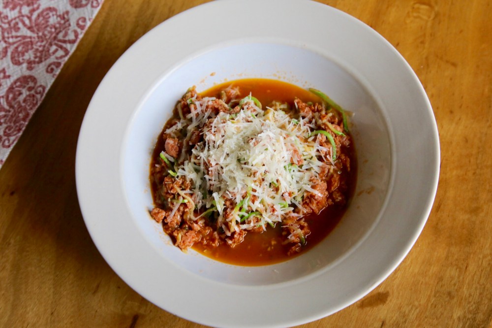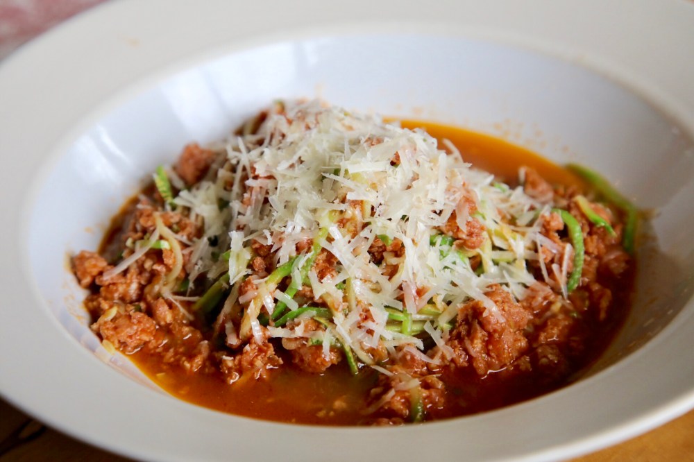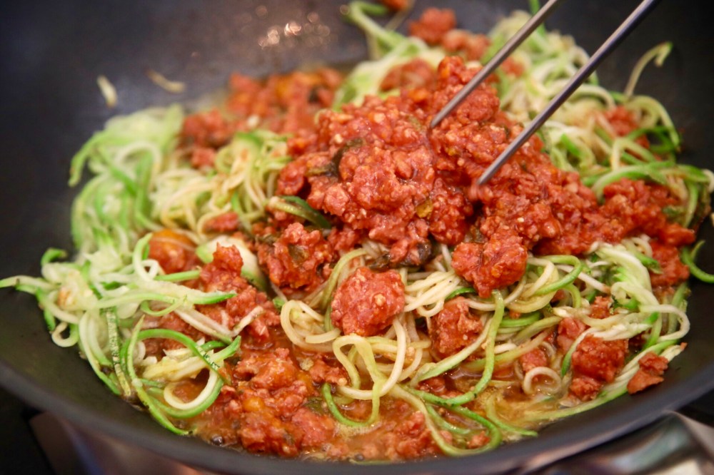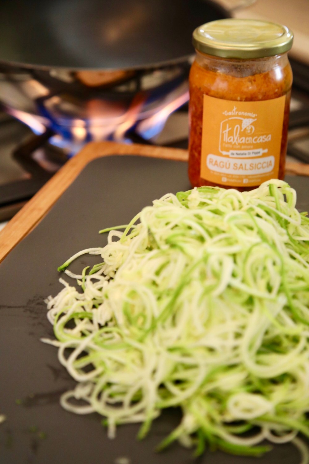 Pero hoy pensamos también en personas que estén a dieta, alimentación baja en carbohidratos, keto, GF y quisimos hacer unos spaghetti pero de zucchini con nuestro Ragú de salsiccia (chorizo).