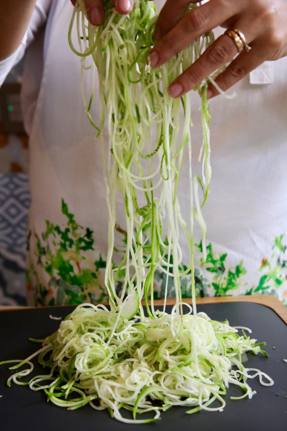 Primero lavamos bien el zucchini y utilizamos alguna de las múltiples marcas y utensilios que ahora existen en el mercado para hacer spaghetti de zucchini… lo reducimos a spaghetti (un típ si no tienes ningún aparato de esos, es utilizar un pelador de papas, en ese caso te quedarán más como tagliatelle;))