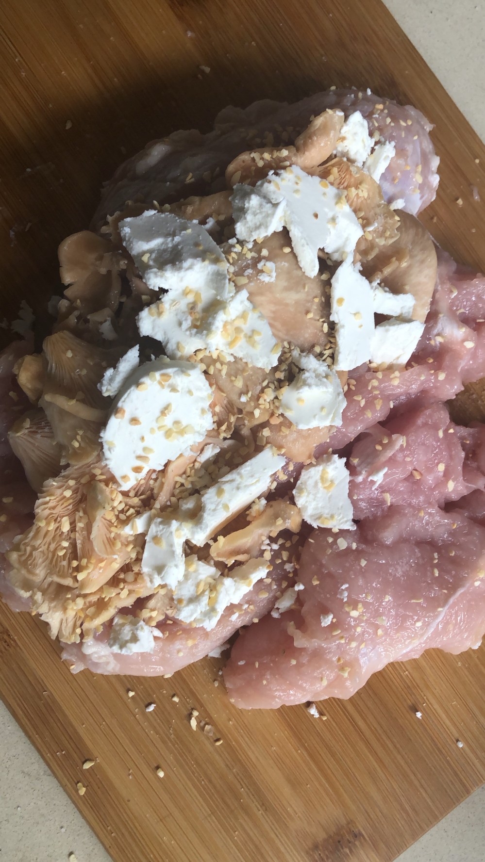 La pechuga de pavo normalmente viene en un empaque de plástico y congeladas, lo ideal es dejarla descongelar en refrigeración, Cunado ya descongeló sacarla del empaque yo descarto una salsa que trae que está llena de azúcares y ultra procesados… la pechuga viene normalmente en un enrejado entonces lo ideal es romper con tijera y abrir la pechuga, sal pimental al gusto e incorporar los hongos frescos y el queso de cabra. Con las manos tratar de cerrar la pechuga.