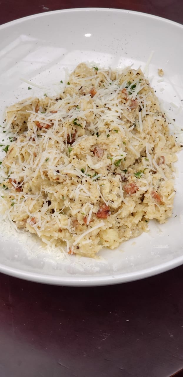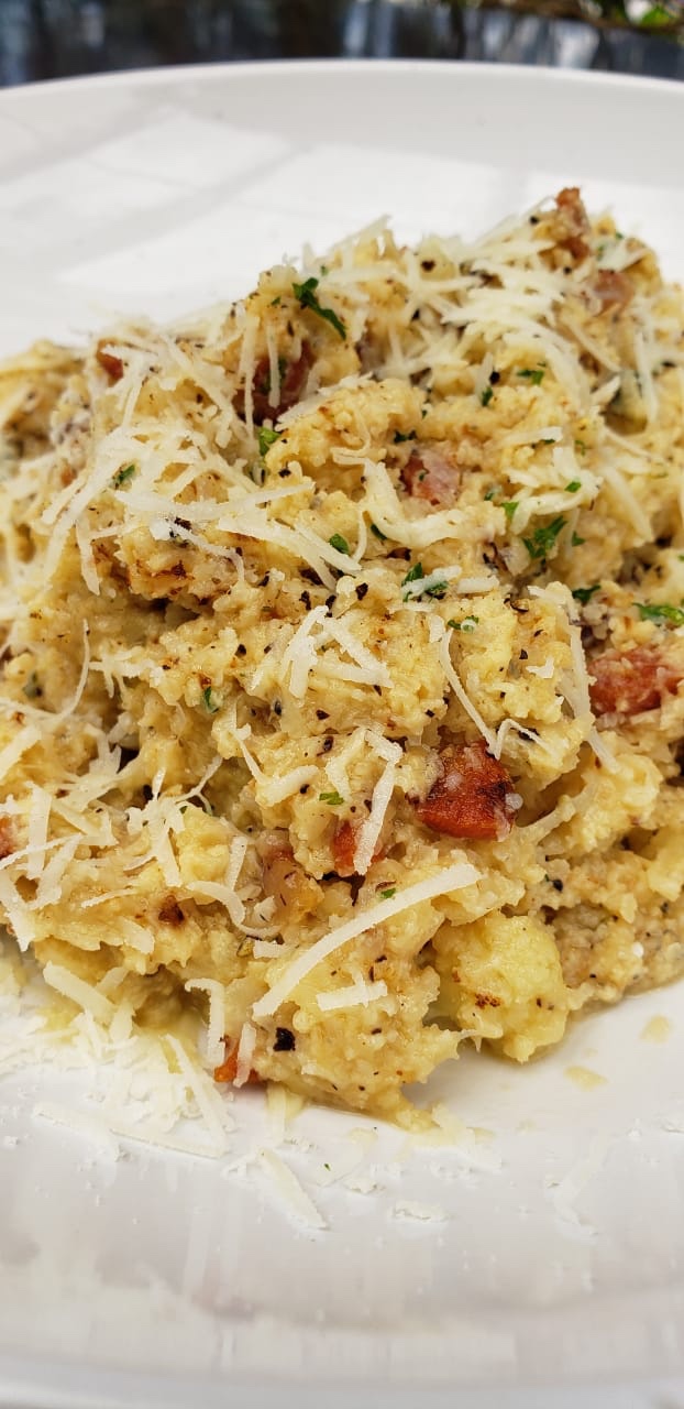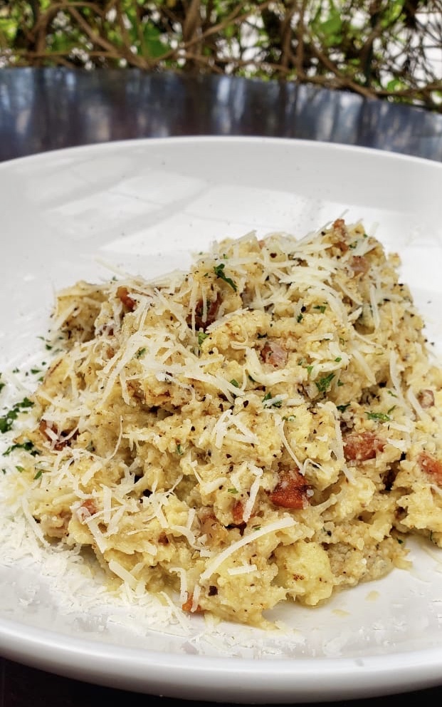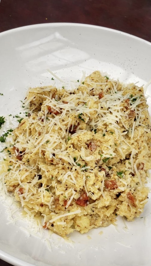 Empalagas con un poco más de queso Pecorino rallado sobre el Risotto keto allá carbonara.