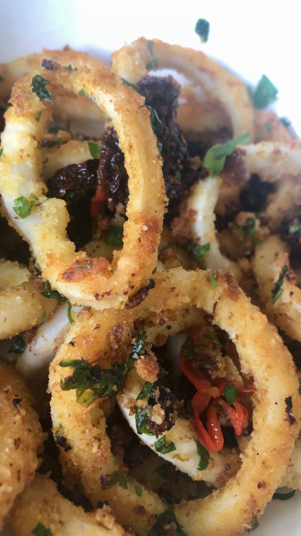 Agregar nuevamente los calamari previamente fritos, finalizar salteando con chile panameño, sal y perejil.