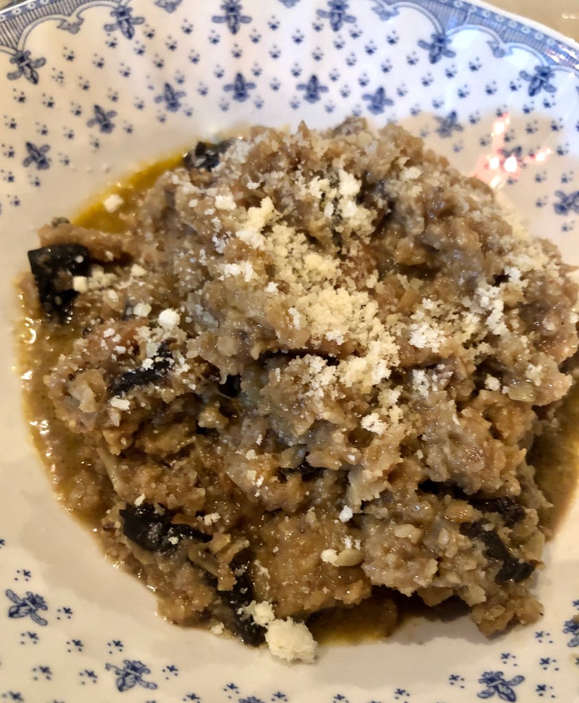Unos minutos antes de terminar la preparación, pruebe que el grano esté cocido durito pero suave a la vez, el termino de un risotto a diferencia de la pasta que es “al dente” sería “all’onda”, se agrega el resto de los hongos, se apaga el fuego, se espera 1 minuto y fuera del fuego se crema con 3 cucharadas de mantequilla y 4-5 cucharadas de queso Parmigiano rallado en el momento o Grana Padano. Esto hará amalgamarse todos los ingredientes y dar un brillo y cremosidad.
