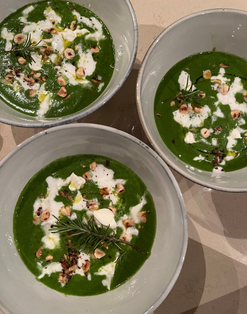 Para preparar esta crema, ayer fui a la feria del agricultor y conseguí todo fresco. Son pocos ingredientes los que se necesitan pero él colorida y vitaminas que nos aportan son esenciales: espinacas, yo use chayote (porque soy keto) pero si usted no lo es puede usar papa, cebolla blanca, romero, caldo de pollo o vegetal y yo use leche de almendra como alternativa a la leche por la lactosa pero ustedes pueden decidir cuál quieren usar 😉 como acompañamiento use burrata de búfala por lo mismo de la lactosa pero si no tienes problema utiliza Mozzarella normal, yogurt griego, parmesano, nata o crema tú decides.